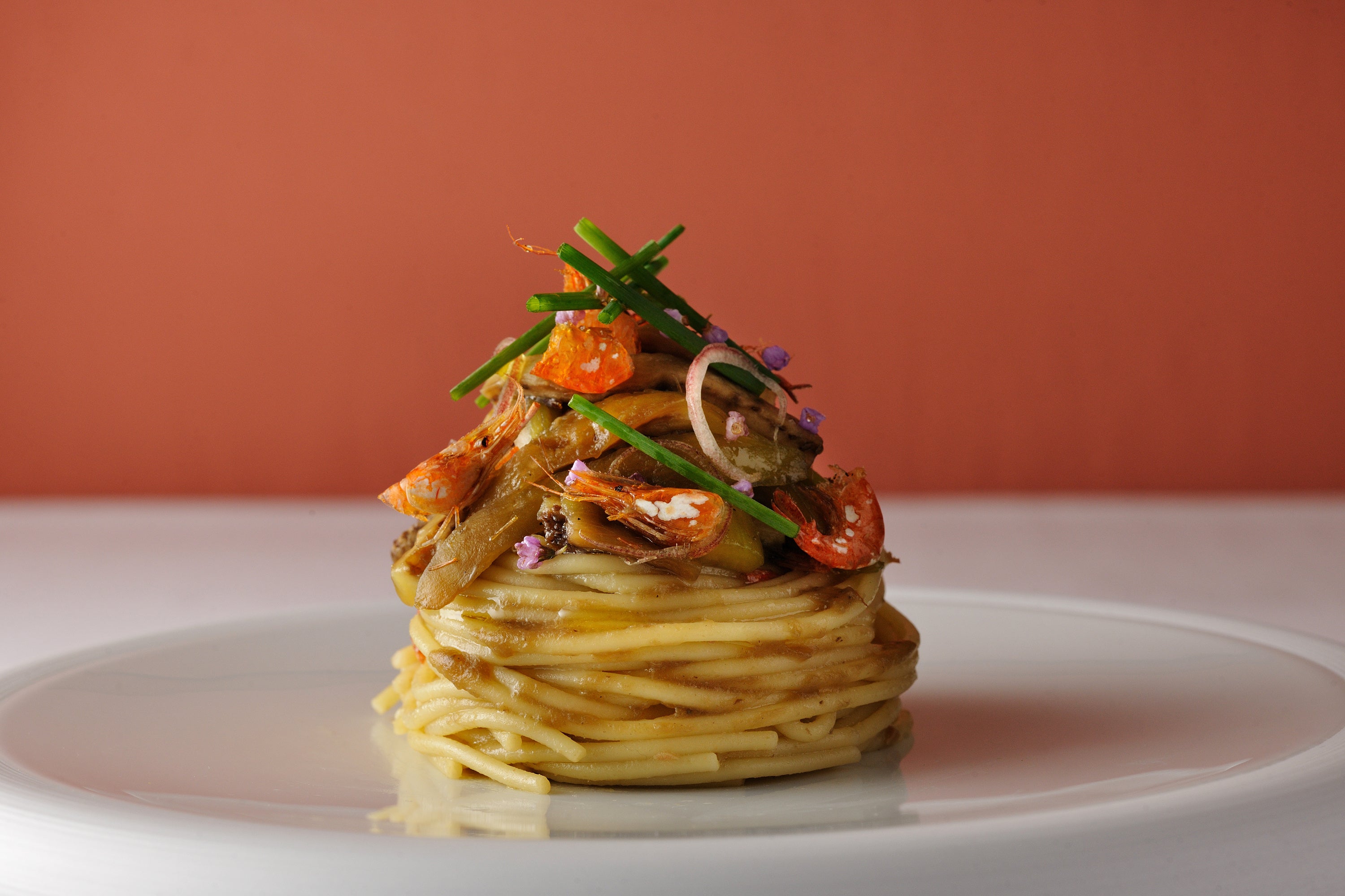 香り高く仕上げた川海老と焼きナスをふんだんに使ったパスタ料理です。アンチョビと行者ニンニクのピュレを合わせることで焼きナスの旨味を引き出しました。仕上げに添えた花穂じそや茗荷の上品な風味がアクセントの一品です。