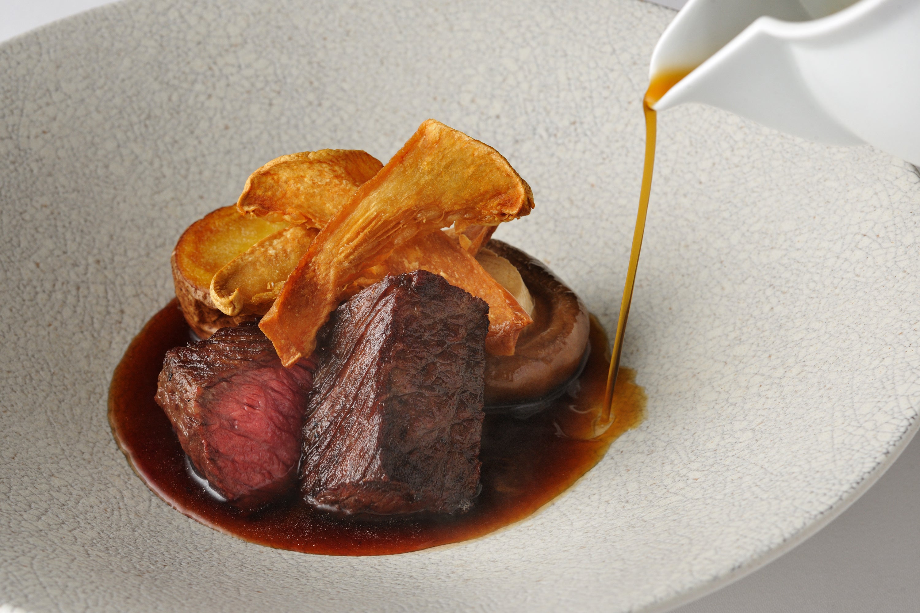 香ばしく焼き上げた牛肉に、サイフォンでキノコの旨味を抽出したコンソメを合わせたズッパ仕立ての一品です。付け合わせには、じゃがいものローストとカリカリに仕上げた白霊茸のチップ、旨味を含ませたシイタケを添えました。牛肉とキノコがそれぞれを引き立て合い、秋らしい風味豊かな味わいを楽しめます。