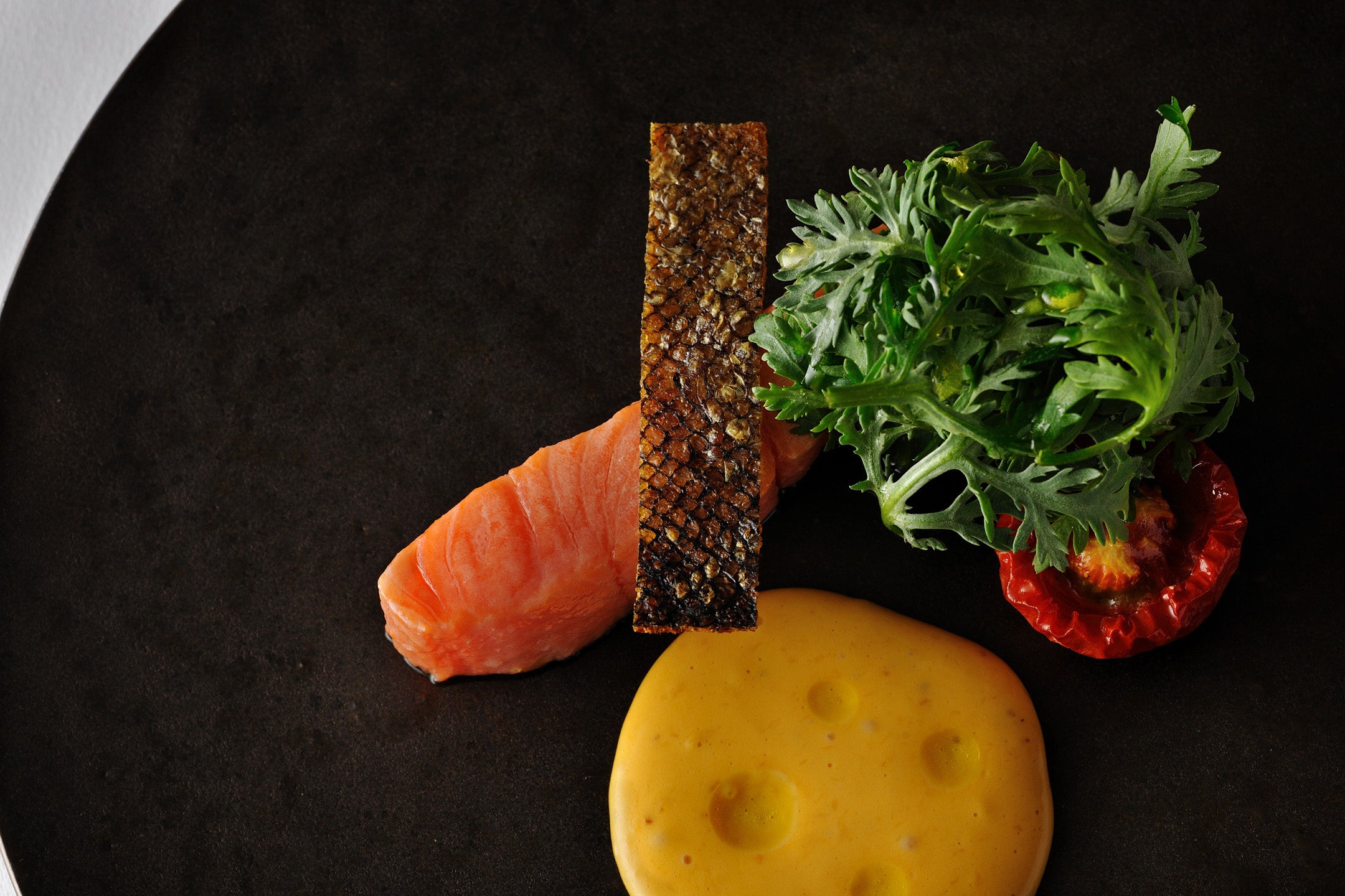 しっとりと蒸しあげた虹鱒に軽やかな卵黄のソースを合わせました。加熱することで旨味を凝縮したトマトとホワイトバルサミコを効かせた春菊のサラダ、パリパリに焼きあげた虹鱒の皮を添えました。