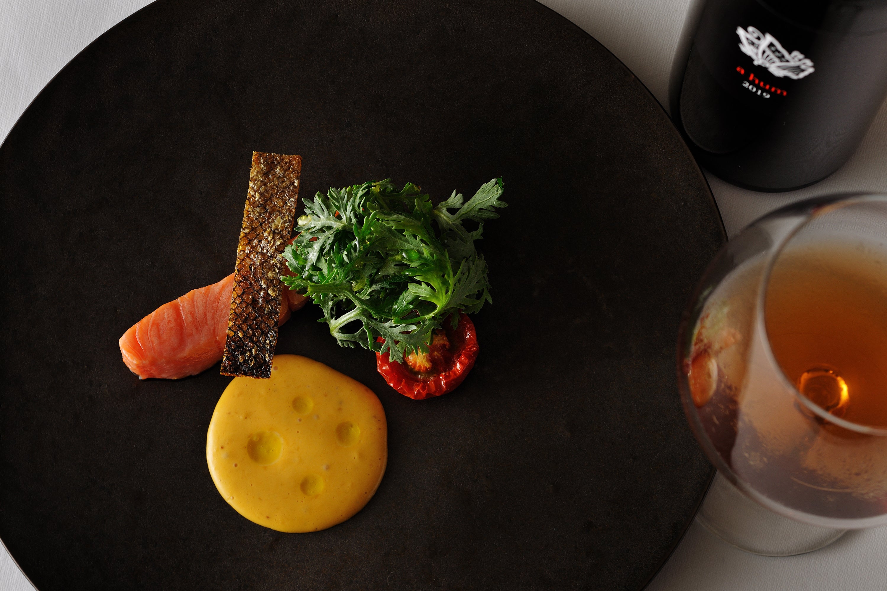 ワインの果実や紅茶の香りや粘性を感じるテクスチャーが、しっとりとした虹鱒の質感や旨みに寄り添い引き立てます。卵黄ソースとまろやかに融合し、春菊やセミドライトマトをマスと合わせると更に奥行きのある味わいとなります。