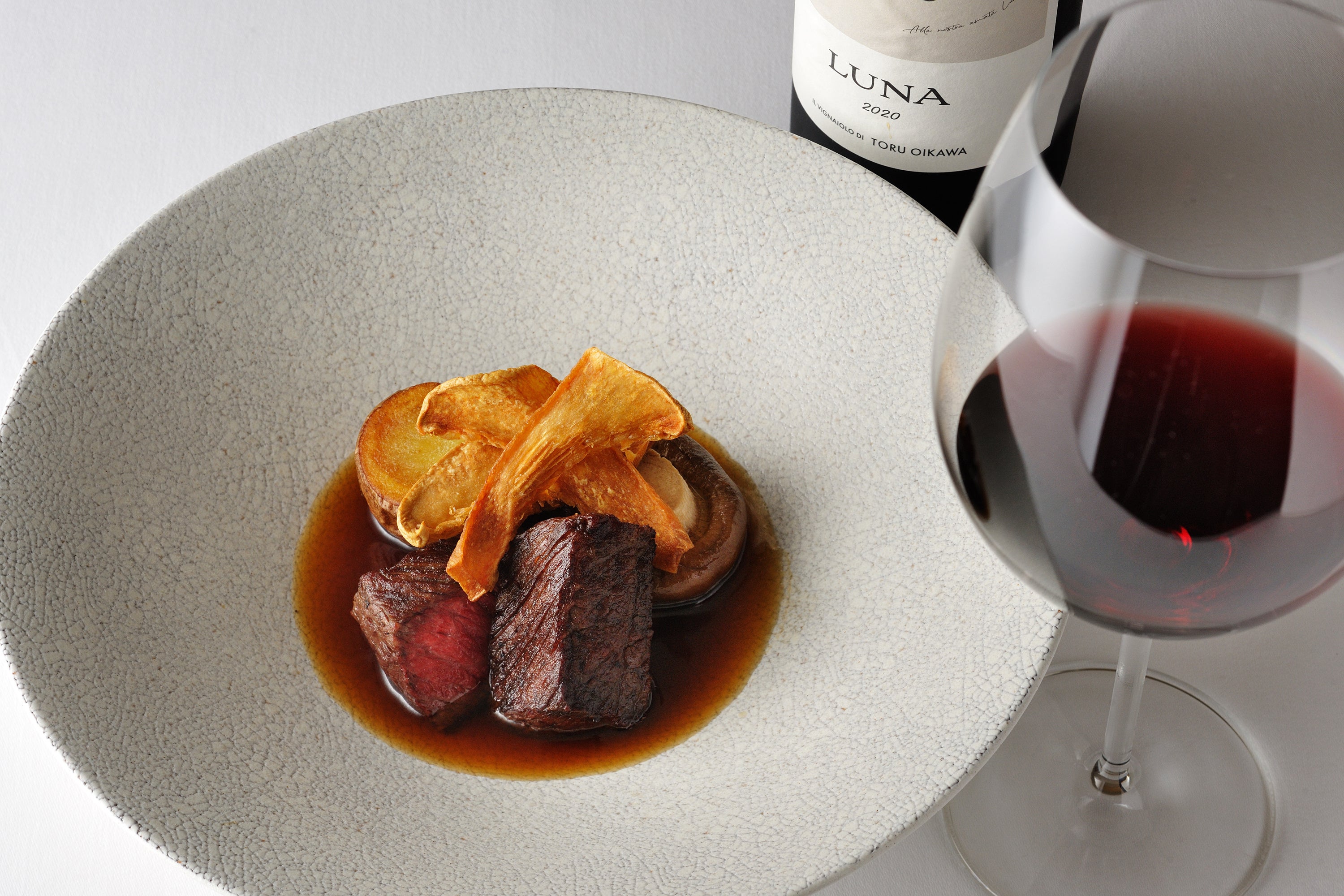 ブルネッロの巨匠カーゼバッセで研鑽を積んだ及川徹氏が造り上げる衝撃のトスカーナIGT「ルーナ」。カベルネ・ソーヴィニヨン主体のワインの雄大な果実とミネラル感、なめらかなタンニンが、キノコのコンソメの旨みを引き立て調和し、やわらかな余韻が、牛肉の風味に華やかさを与えます。
