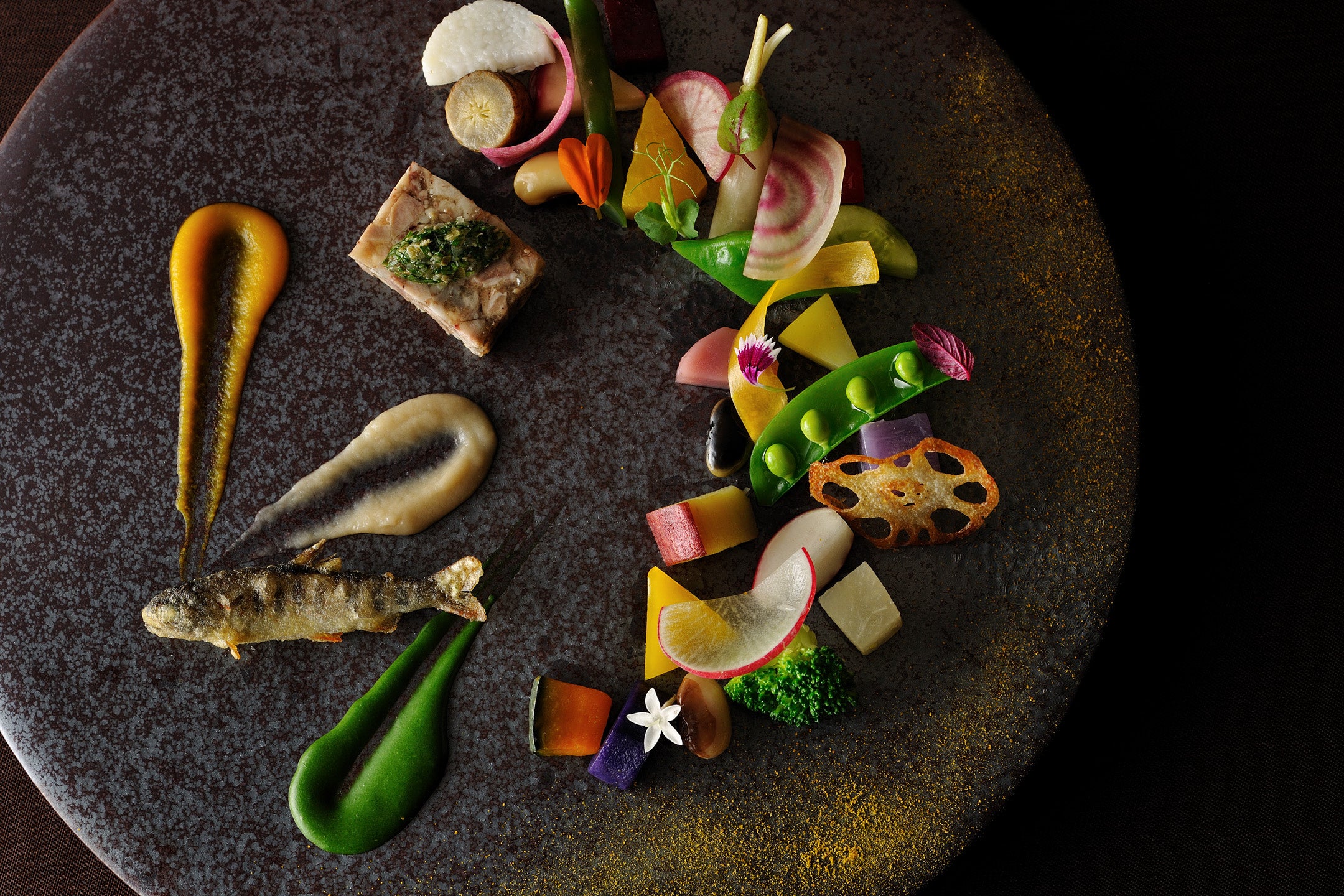 八ヶ岳の野菜畑を表現したOTTO SETTEの代表的な一皿です。サツマイモやカボチャなど30種類の野菜を、ナッツのコンディメントと合わせました。イタリアの郷土料理のソップレサータ(*1)、アマゴのフリットなど多彩な味わいを楽しめます。バターナッツ、小松菜、カリフラワーのバーニャフレッダの3種類のソースとともに楽しめます。