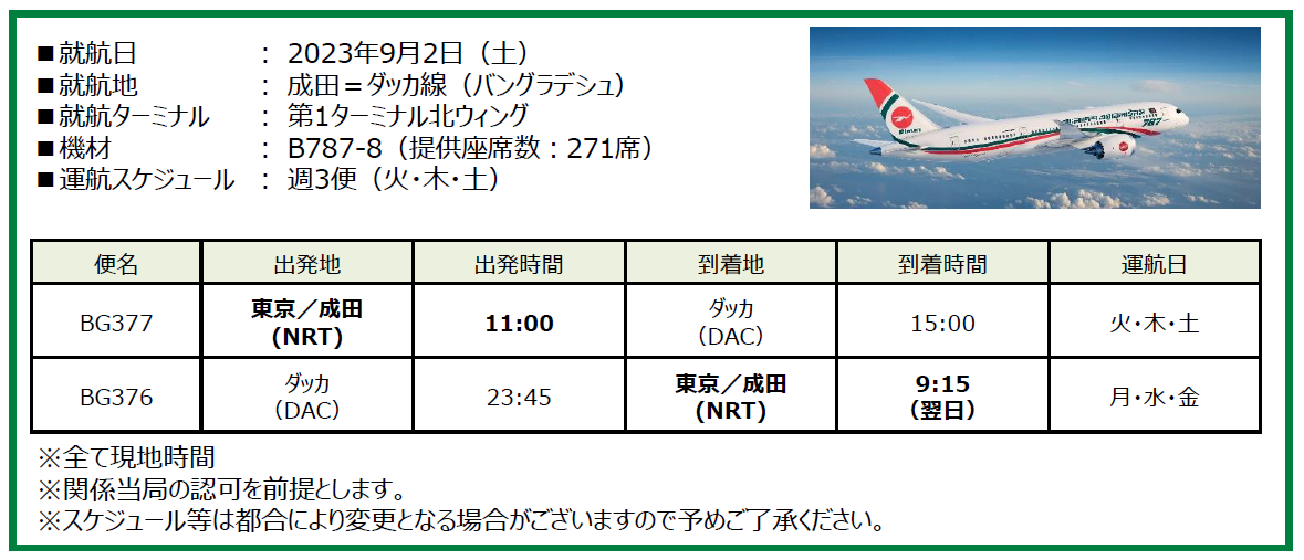 ビーマン・バングラデシュ航空(IATAコード:BG)は、2023年9月2日より成田=ダッカ線に約17年ぶりに定期旅客便として就航することとなりました。同社はバングラデシュのナショナルフラッグキャリアであり、ダッカー成田間を6時間半で結ぶ唯一の航空会社となり、本路線は日本からのダッカへの初の直行便となります。
