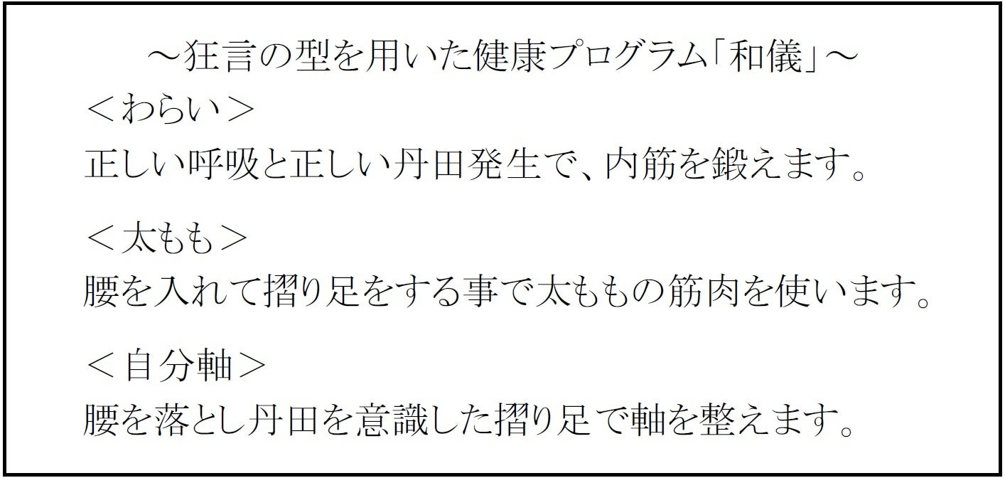 「和儀」とは、古来、伝承された和文化である狂言の鍛錬を、健康メソッドとして構築。心身健康でいるには、「わらい」「太もも」「自分軸」などの狂言の型(カタ)に秘訣があり、本来の日本人の健康を取り戻すことを目的としています。