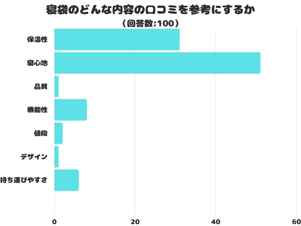 寝袋のどんな内容の口コミを参考にするかをアンケートにて調査したところ、1位は「寝心地」でした。