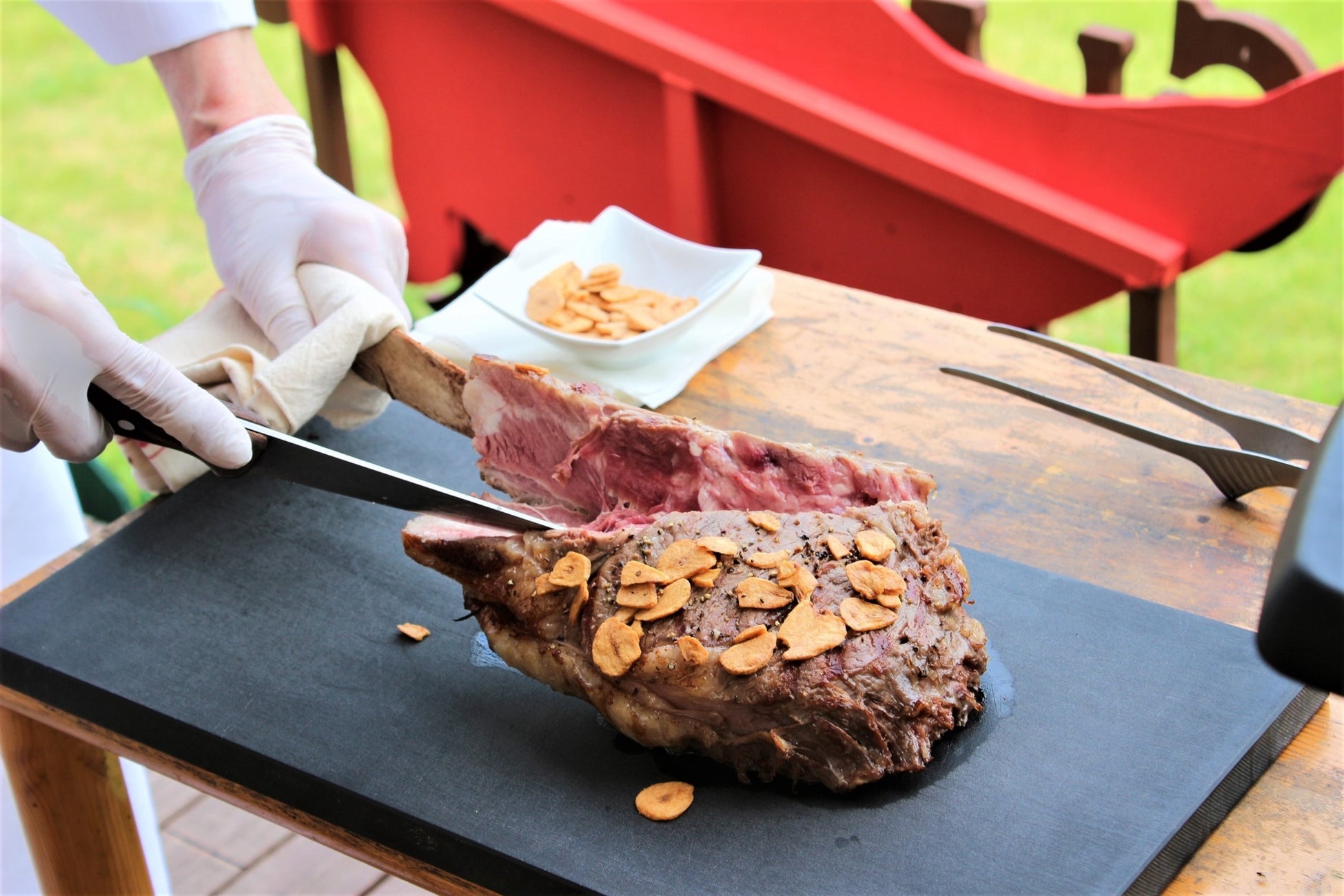 スキージャム勝山では「素材の良さを引き出すプロの技を目の前で」をコンセプトに、9月1日(金)より期間限定でホテルシェフがお客様の前で仕上げる「約1㎏の骨付き熟成リブ肉」の販売を開始いたします。30日間熟成させた「骨付きトマホークリブ肉」を、独自の低温調理法でじっくり調理したものをお持ちし、ホテルシェフがお客様の目の前で仕上げて最高の状態でご提供します。