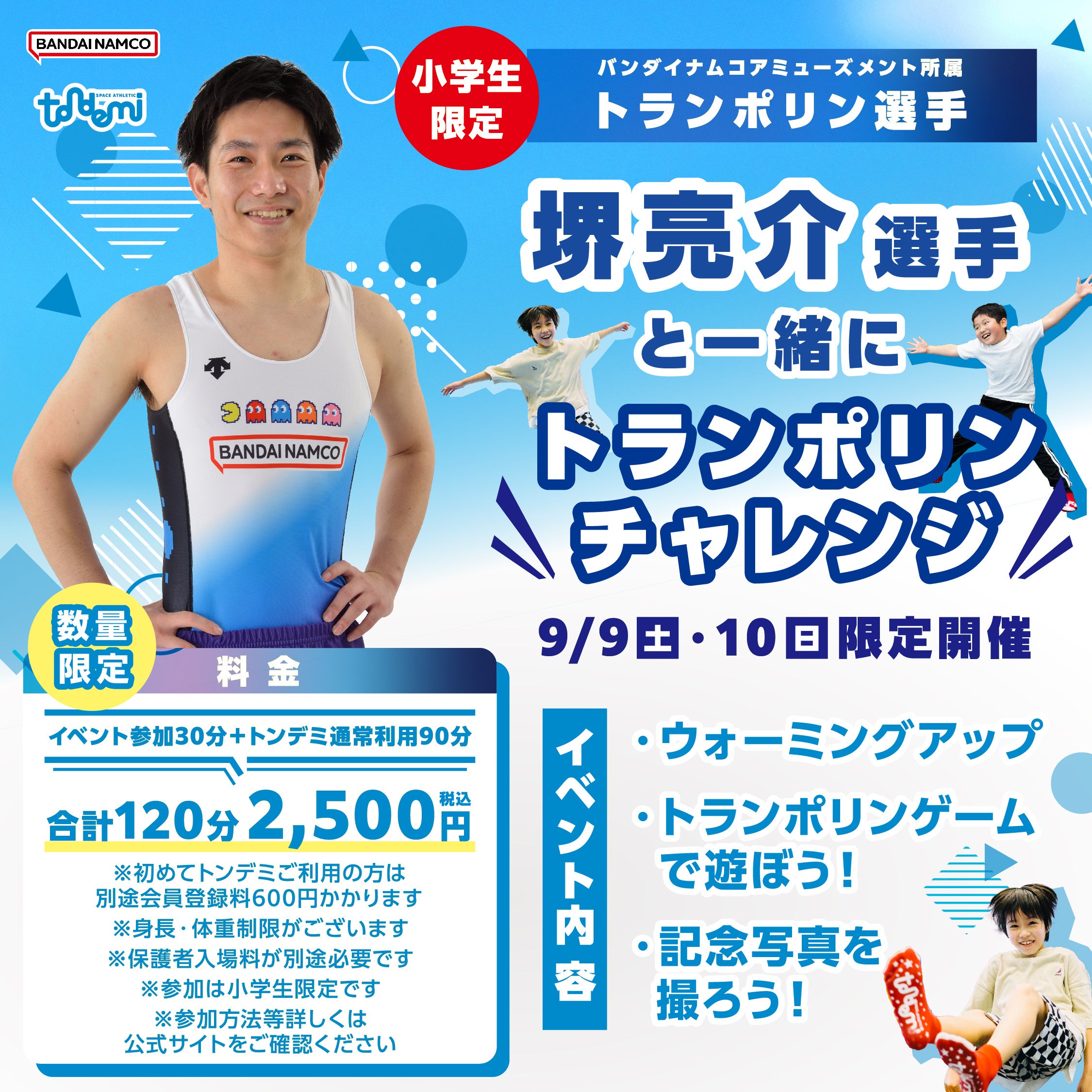 株式会社バンダイナムコアミューズメントは、屋内アスレチック施設『トンデミ幕張』にて、2023年9月9日(土)・9月10日(日)の2日間、バンダイナムコアミューズメント所属のトランポリン競技「堺亮介選手」と一緒にトランポリンにチャレンジできるイベントを実施します。
