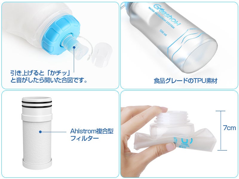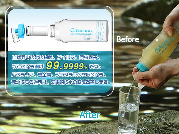 GreeShow携帯浄水器は、災害や断水などの緊急時、地震、津波、台風などの自然災害が発生した時、川やため池の水を安心して飲めるほど透き通った清潔な飲料水にろ過することができます。大切な家族の為の災害時の備え! 緊急用に一つ常備しておくことをおすすめします。
