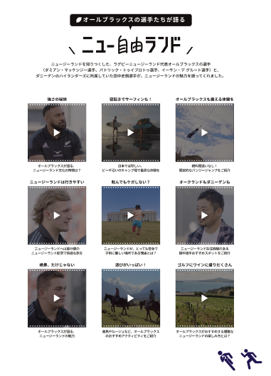 「ニュー自由ランド」特設サイトでは、ニュージーランドを知り尽くしたラグビーニュージーランド代表 オールブラックスの3選手と、ダニーデンのハイランダーズに所属していた田中史朗選手が、9つの動画でおすすめのアクティビティやスポット、楽しみ方などニュージーランドの魅力を語っています。さまざまな分野で活躍する方々による個性あふれる旅へのリンクを集約した「ニュー自由ランド人の旅」も、随時更新しています。