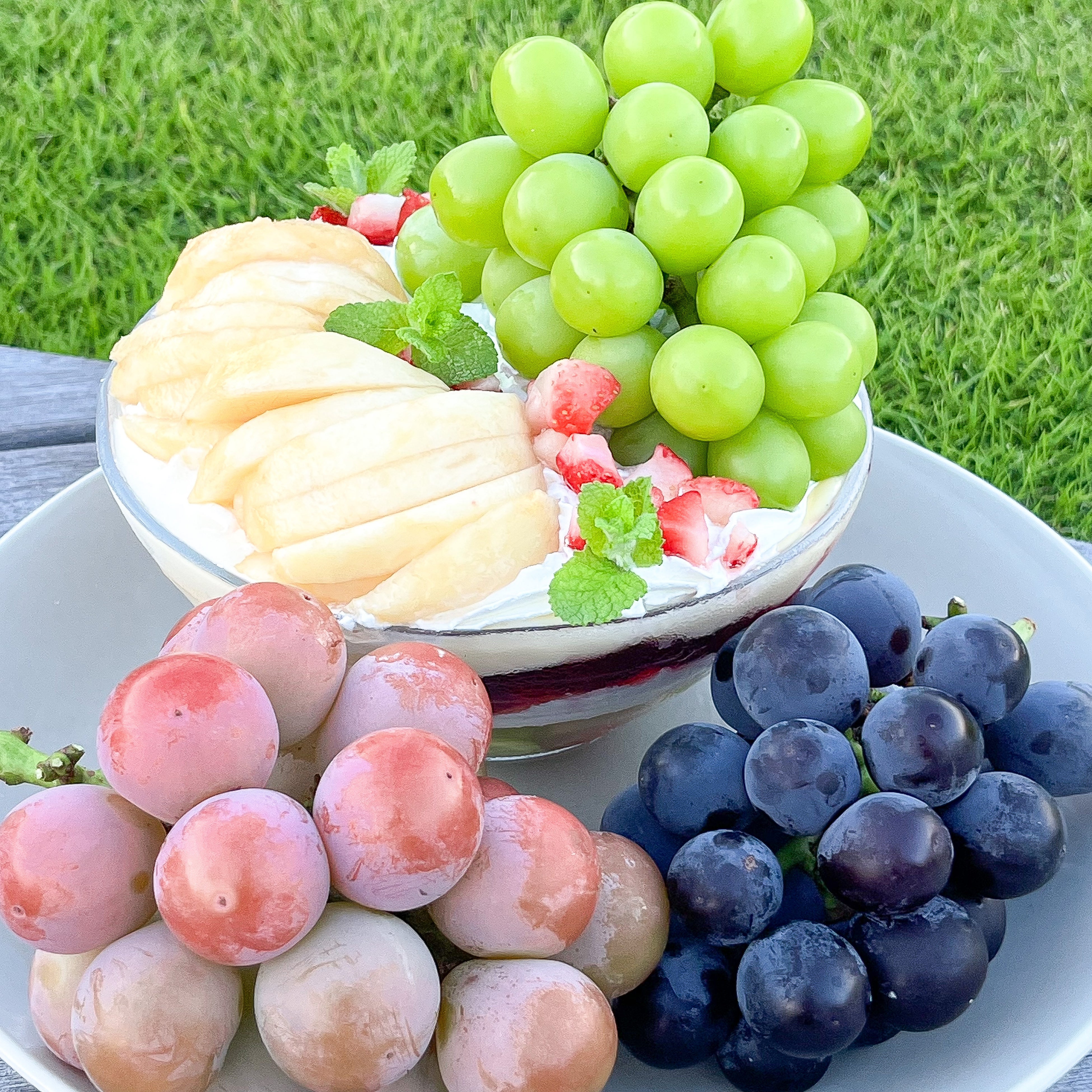 シェアして楽しい!シャインマスカットやニューピオーネなど3種類のぶどうを詰め込んだパフェは、まるで味覚狩りをしているかのような夢のようなパフェです。