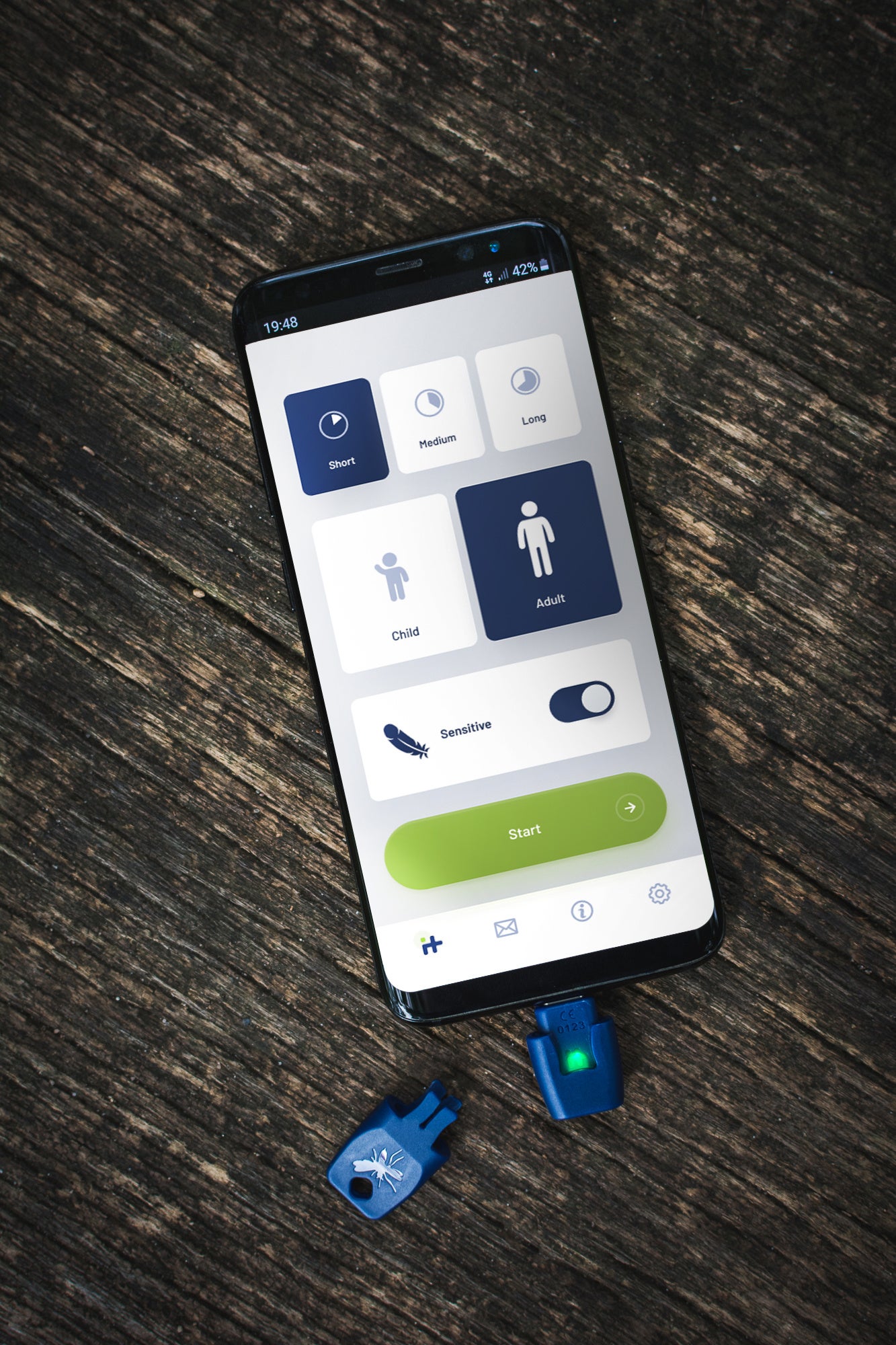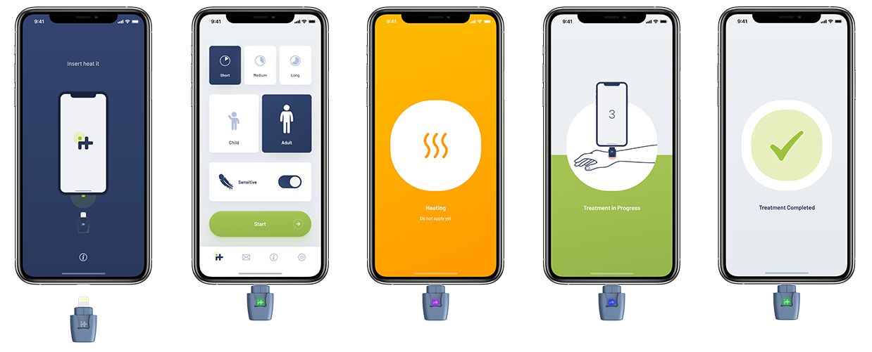 スマホにUSBデバイスを差し込み、アプリを使用して皮膚に4〜10秒間当てるだけでOK。従来の化学物質を含む薬品は不要。