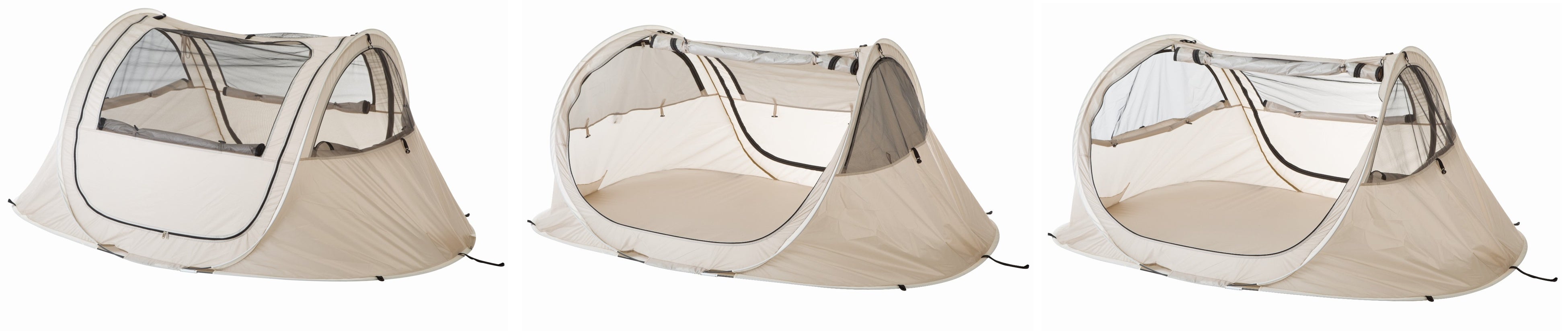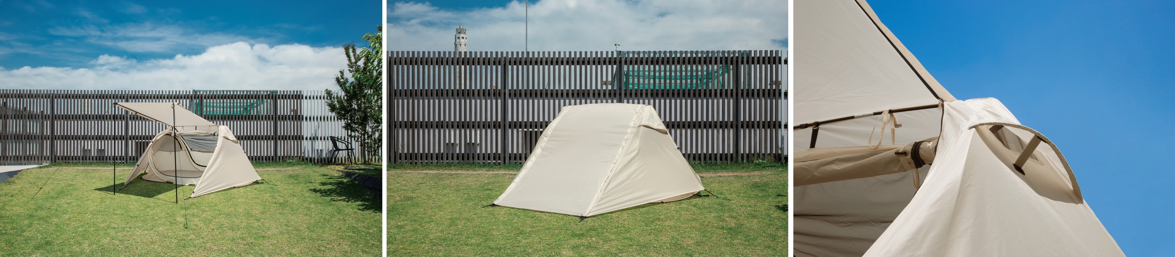 ⑧UPF50+で紫外線をカット。専用ポール、ロープ、ペグ付きで、フライシート部分はタープとして使用でき、昼も日よけしてお過ごしいただけます。