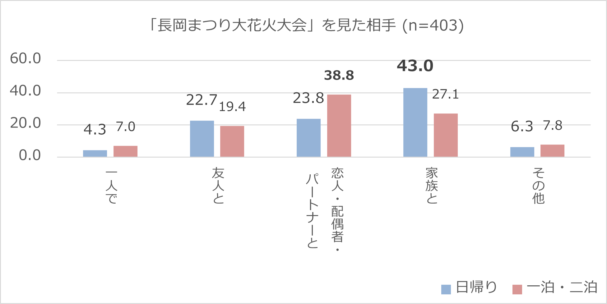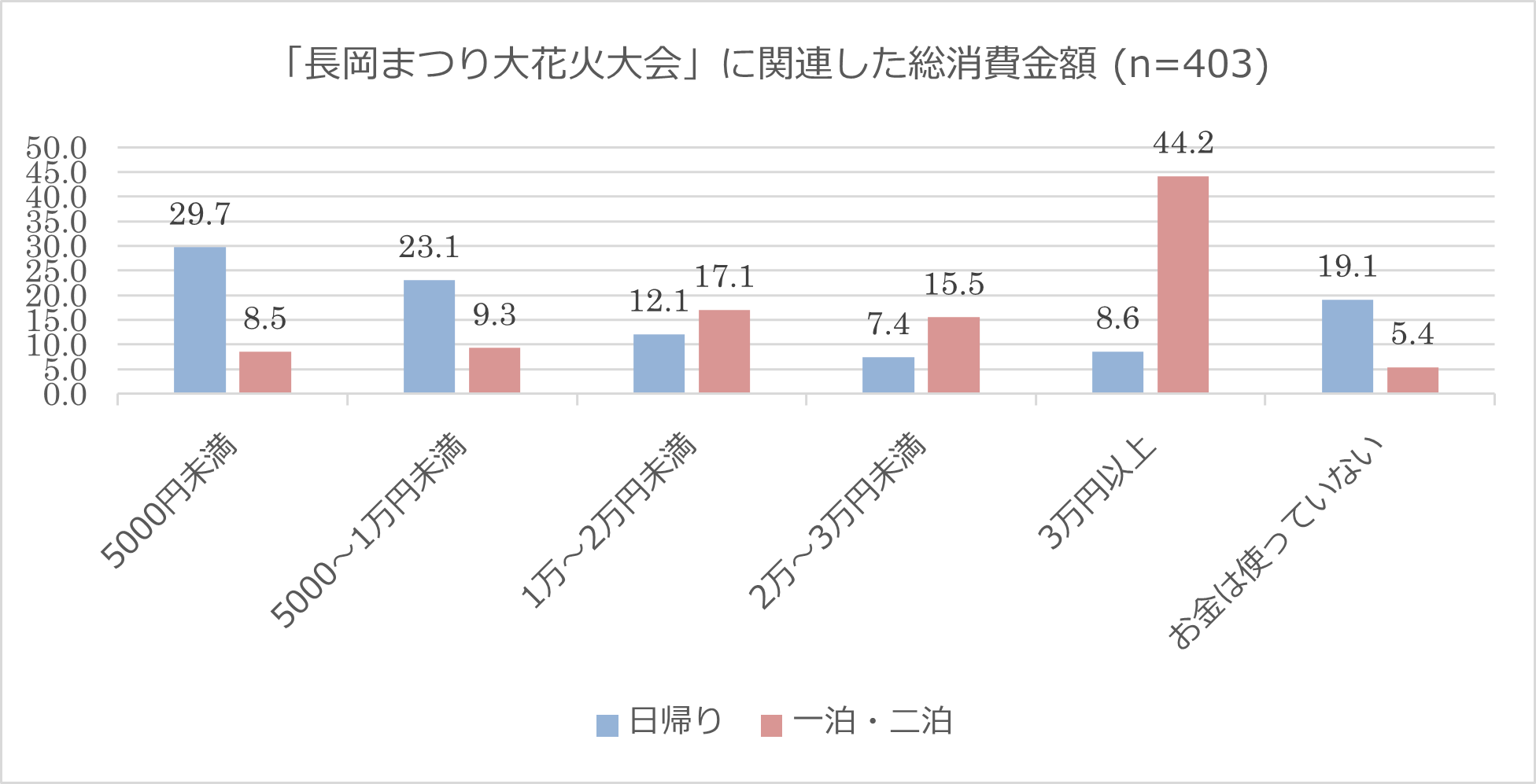 さらに、長岡花火を誰と見たかを問う設問では、「一泊・二泊」回答者では「恋人・配偶者・パートナーと」(38.8%)が多かった一方、日帰り層では「家族と」(43.0%)が最も多く、続いて「友人と」(22.7%)が目立つ結果となりました。加えて「一泊・二泊」回答者は長岡花火に関連した消費金額が最も多く、約44%が「3万円以上」を使ったと回答。