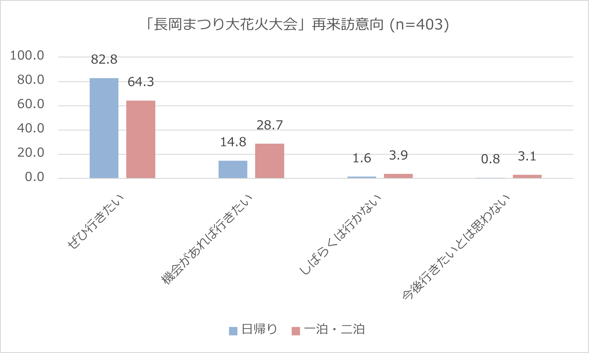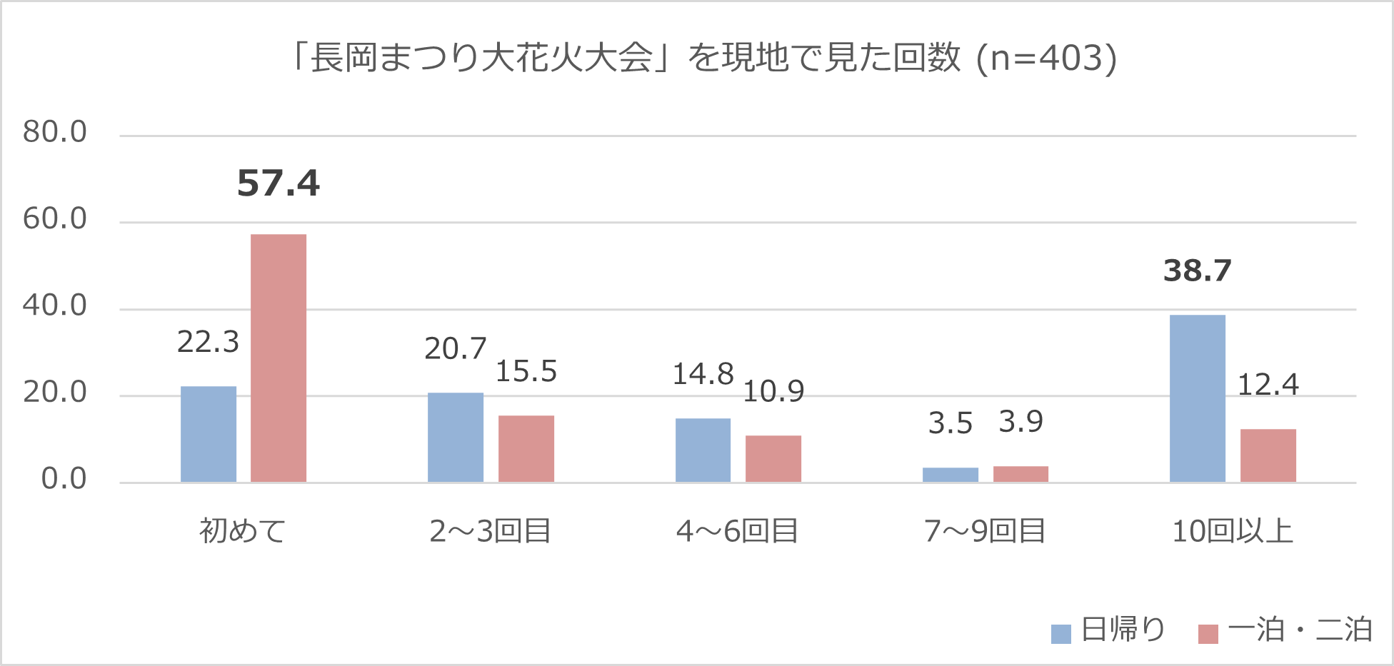 アンケートの結果から浮かび上がったのは、長岡花火の現地鑑賞回数と宿泊状況の間に相関が見られるかもしれないという示唆です。一泊または二泊で現地を訪れた人のうち57.4%が長岡花火を見るのは「初めて」と回答。日帰り客のうち「初めて」と回答をしたのは22.3%であり、大きな差がみられます。一方で、日帰り層のうち長岡花火を「10回以上」見たことがあると回答した人は38.7%と最多でした。