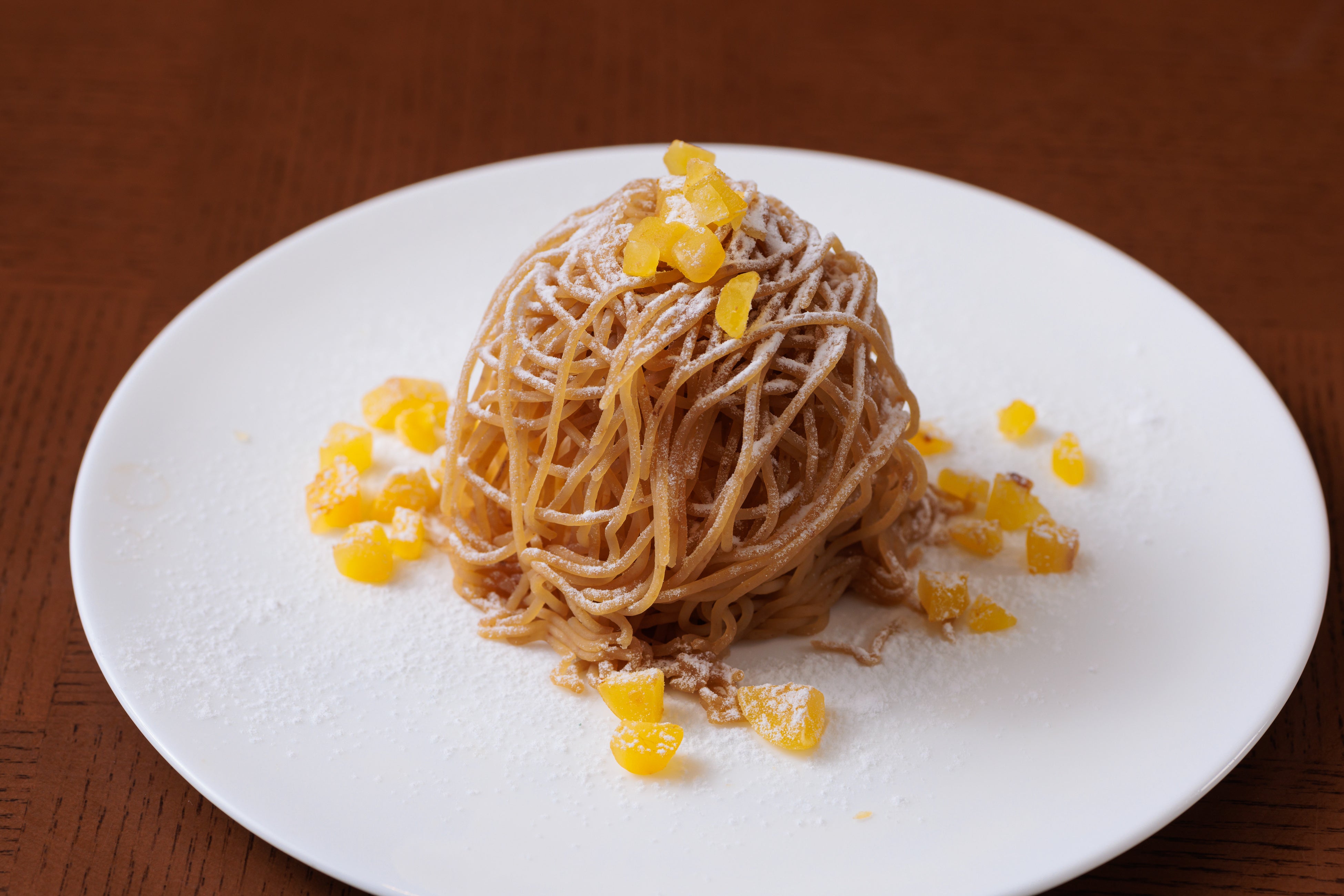 TERRACE & DINING SORAの魅力のスイーツの一つである、シェフが目の前で絞ってご提供しているモンブラン。デザートでも、秋を実感いただけるよう、ほんのり甘味のある栗ペーストの仕上げに、むき栗のクラッシュをかけてご提供します。見た目や、食感でもお楽しみください。