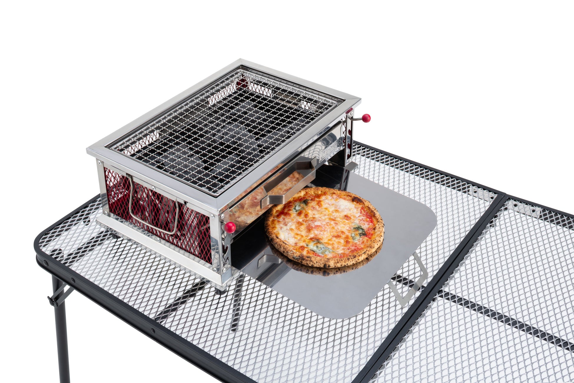炭の熱を有効活用した、簡易オーブン機能付きのテーブルトップグリルです。上と下で同時に調理を行えるため、上でBBQをしながら、下でトーストや冷凍ピザを簡易的に焼き上げるなど、省スペースで手軽に複数の調理が可能です。