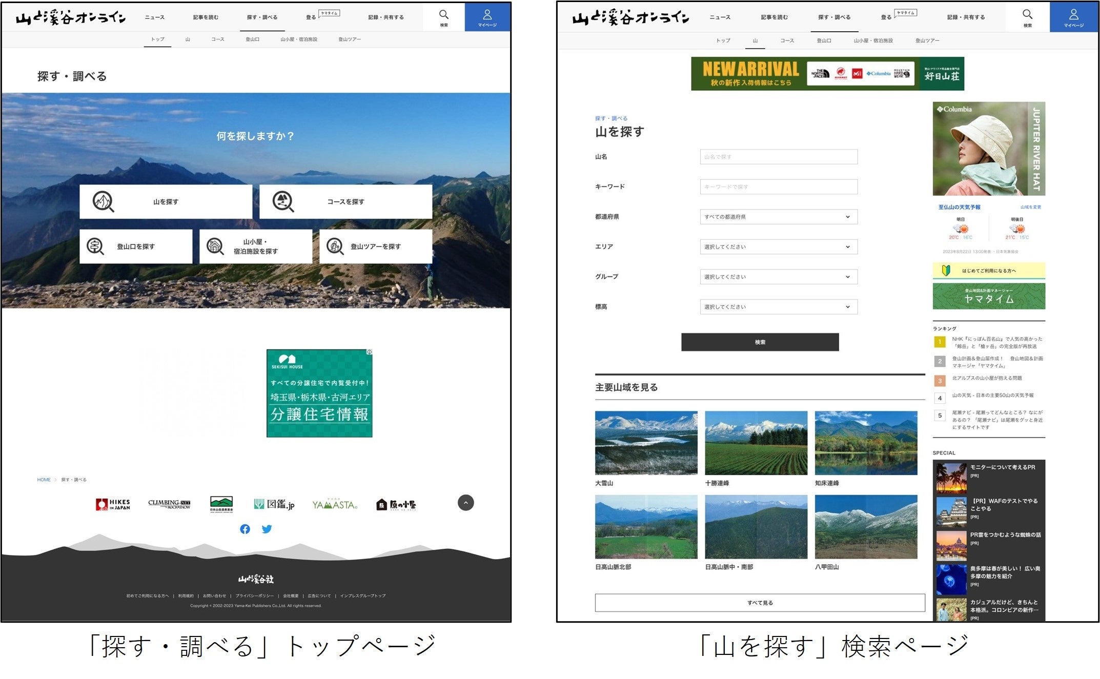8月28日には山や登山コース、登山口、全国の山小屋・宿泊施設、登山ツアーなどのデータベース「探す・調べる」のデザインを変更し、得たい情報にアクセスしやすくなりました。これにより一連のリニューアルが完了し、山の初心者からベテランまで、より親しんでいただけるウェブメディア・サービスとなりました。