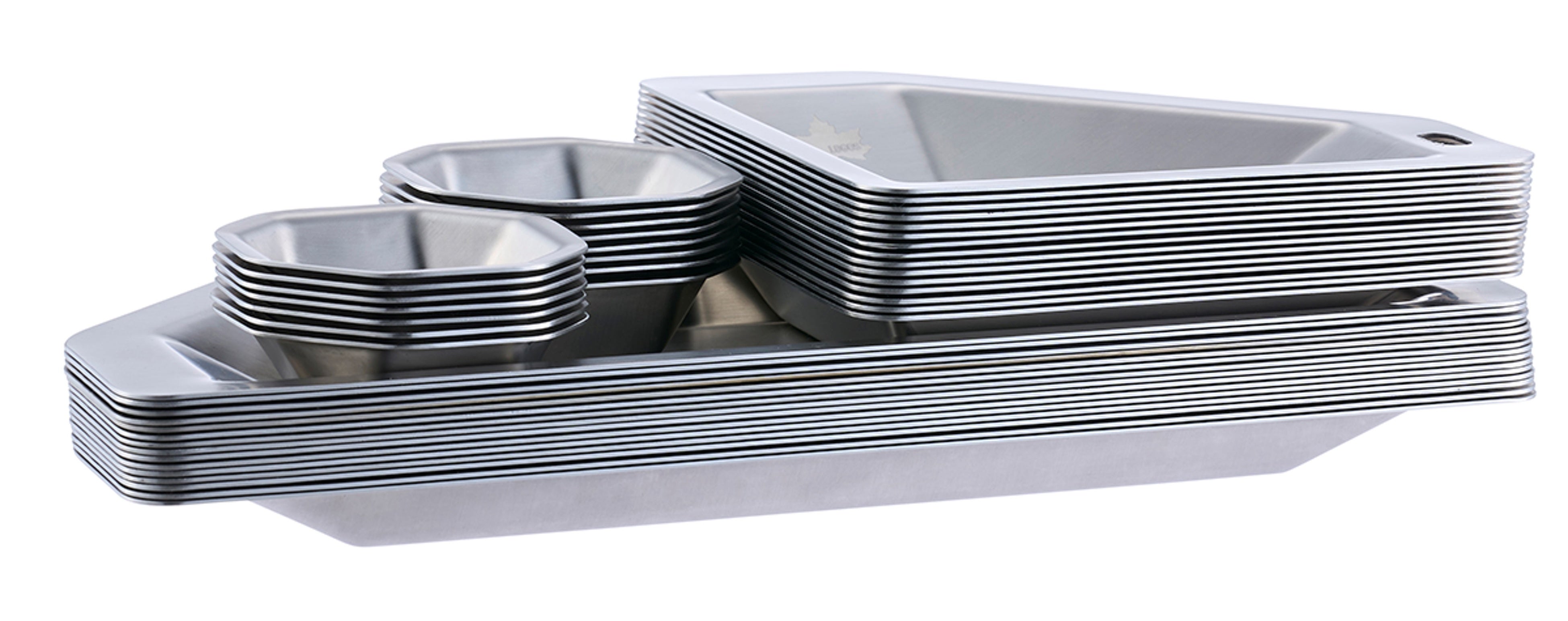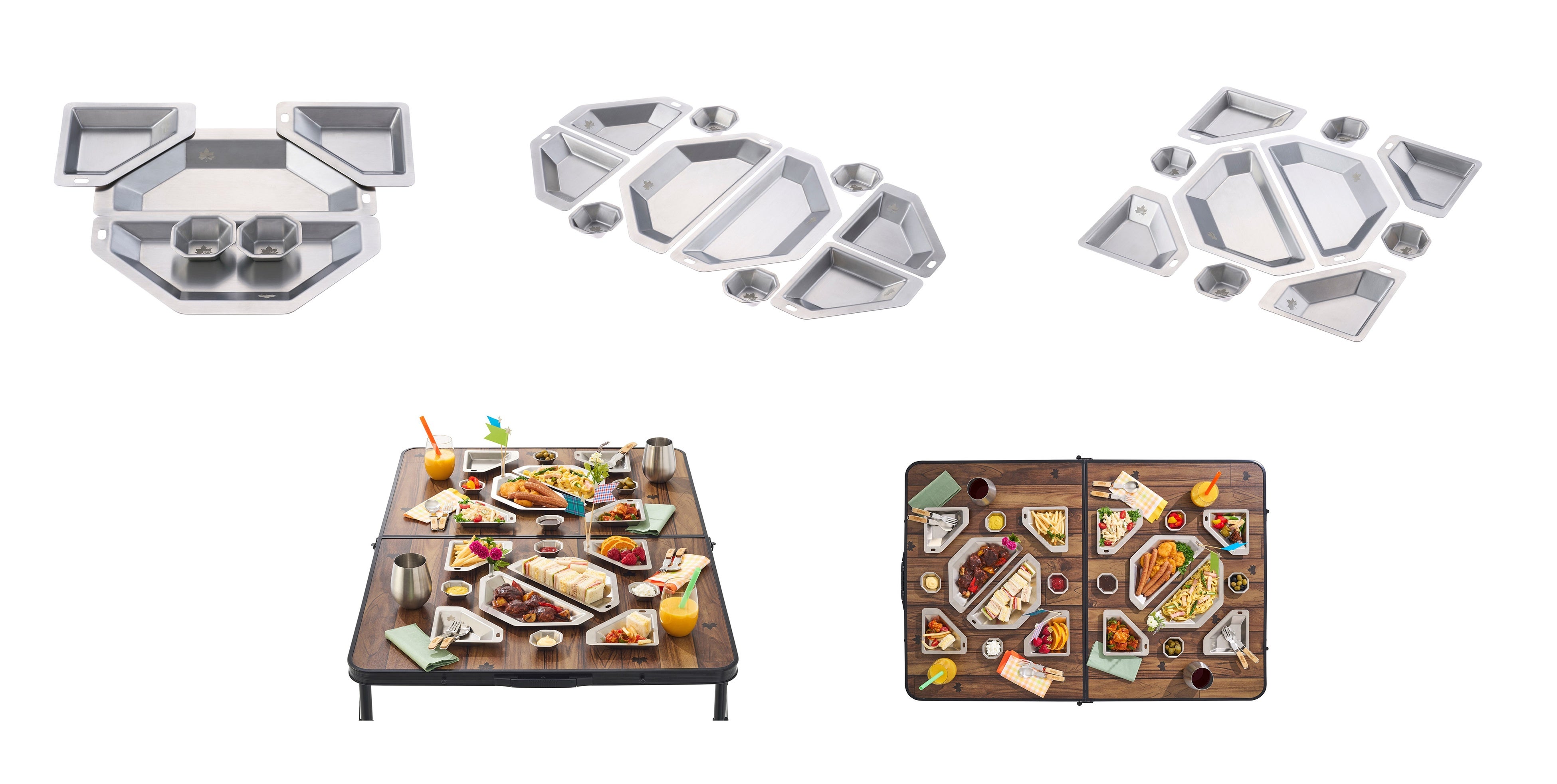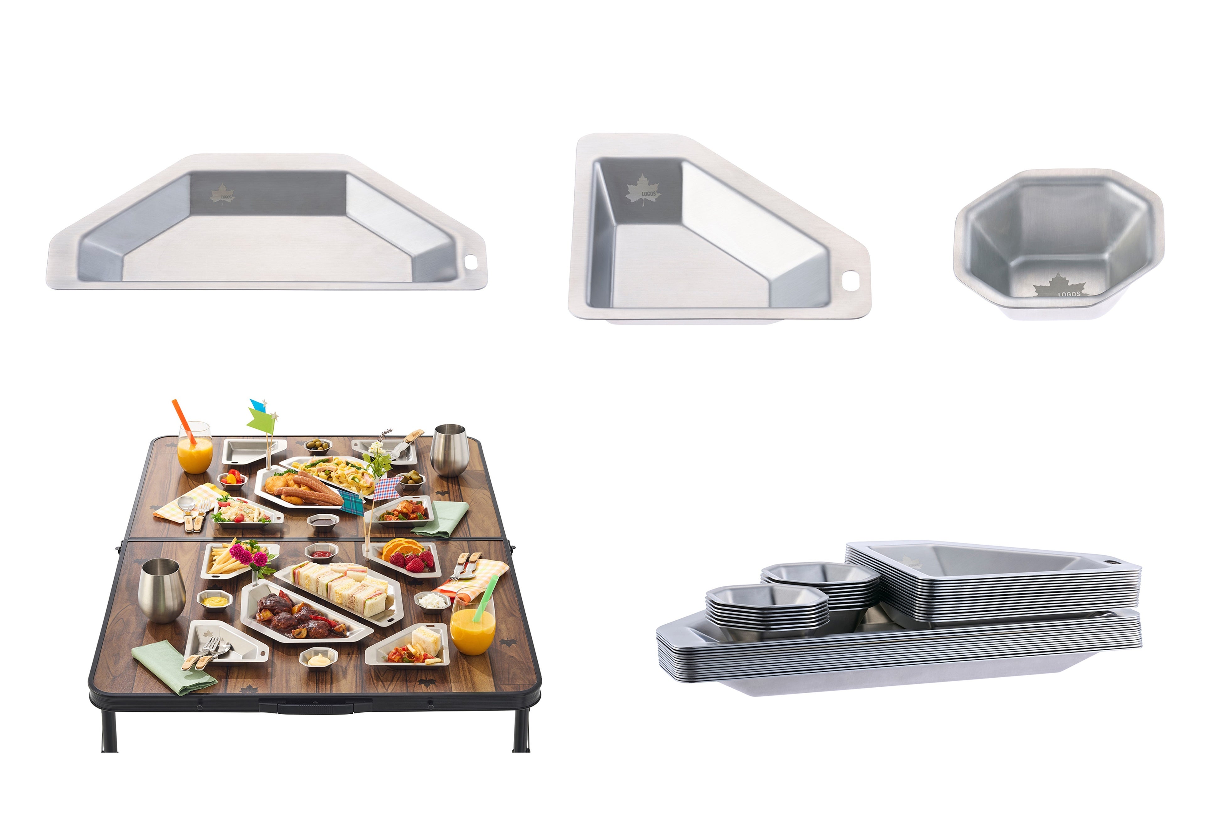 本シリーズは、ポリゴン形状が特徴的なステンレス食器です。メイン料理はもちろん取り分け皿としても便利な中皿(パーティープレート)、副菜やお菓子などのデザートをいれるのにも適した小皿(プレート)、タレなどの調味料や少量のおかずを入れるのにちょうどいいサイズの豆皿(ミニボウル)の3種類をラインアップします。