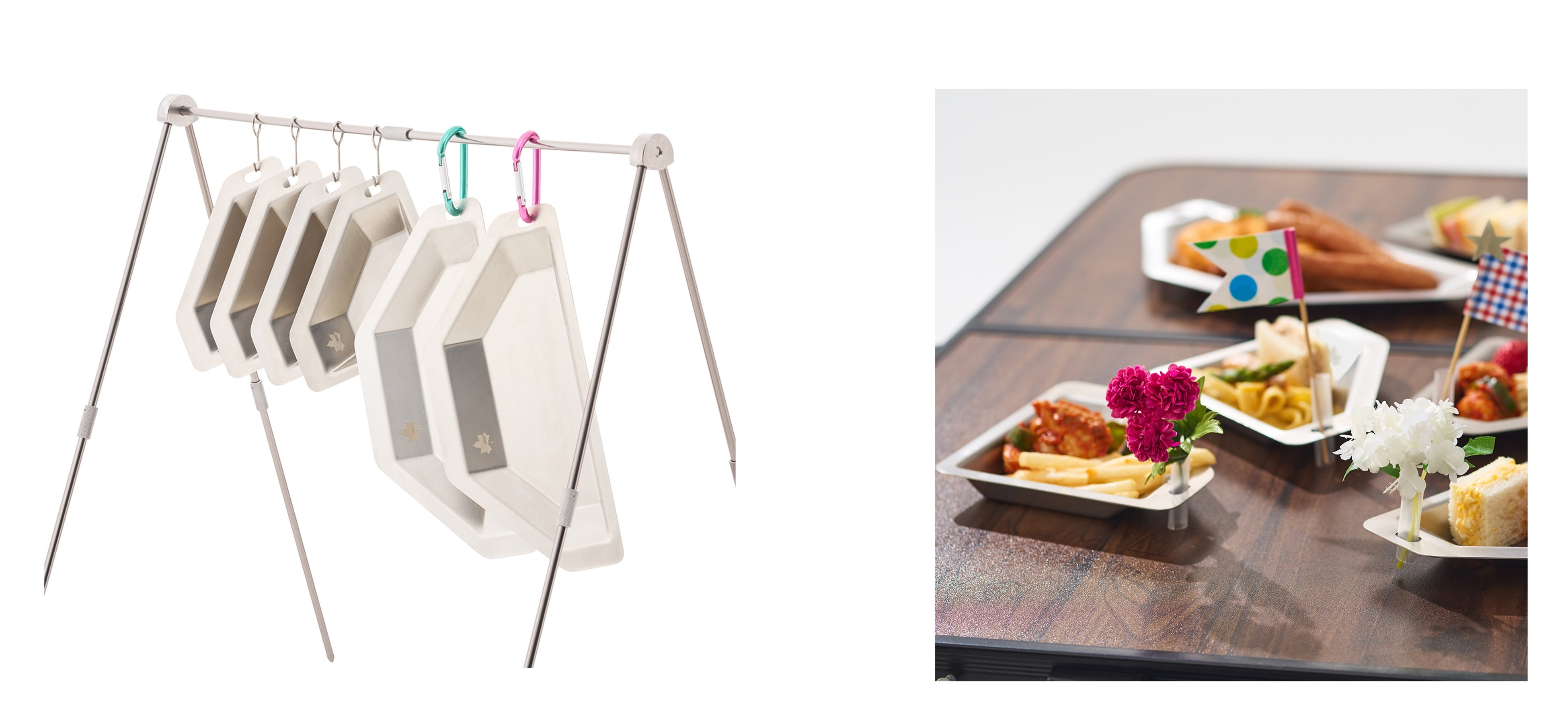 オーバルホールがあるので、市販のカラビナやS字フックを使えば吊り下げての収納に便利。さらにフラッグなどを立てると、見た目も華やかで誰のお皿か分かりやすくなり、パーティーシーンに最適。