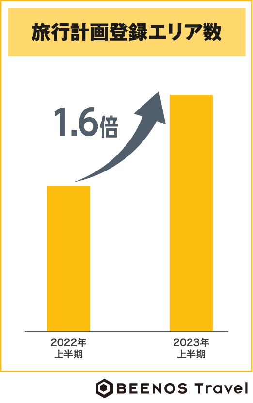 2023年1月~6月期の旅行計画で行先に設定されている地名は、前年同期比で1.6倍に増加しました。「北海道」「東京」「大阪」「沖縄」といった都道府県単位の地名だけではなく、東京であれば区単位など、より細かなエリア名での旅行計画が作られていることが、エリア数増加の要因となっています。エリア数の増加についても、実際に訪日できる状況になり実際の訪日予定に即した計画が増加していることの影響だと考えられます。
