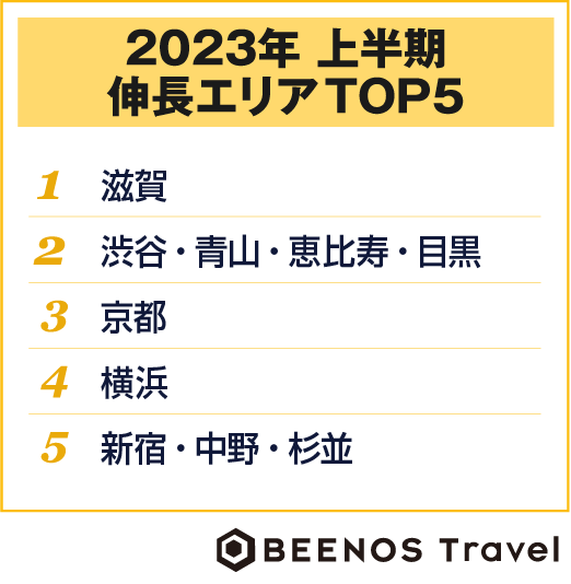 2023年1月~6月の旅行先エリアは、1位沖縄、2位京都、3位大阪と、人気エリアが上位をしめました。10位には滋賀県がランクインしており、全体として関西圏の人気が高いことが分かります。沖縄、関西圏の人気はコロナ禍中の2020年~2022年の同期比でも共通した傾向です。一方、5位~9位までを東京23区内のエリアが占めていますが、これは今期の特徴的な動きです。