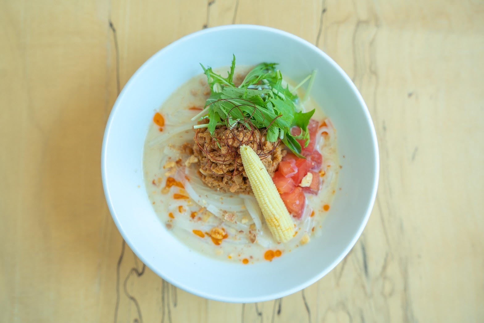 「自家製大豆肉味噌の豆乳坦々フォー」
