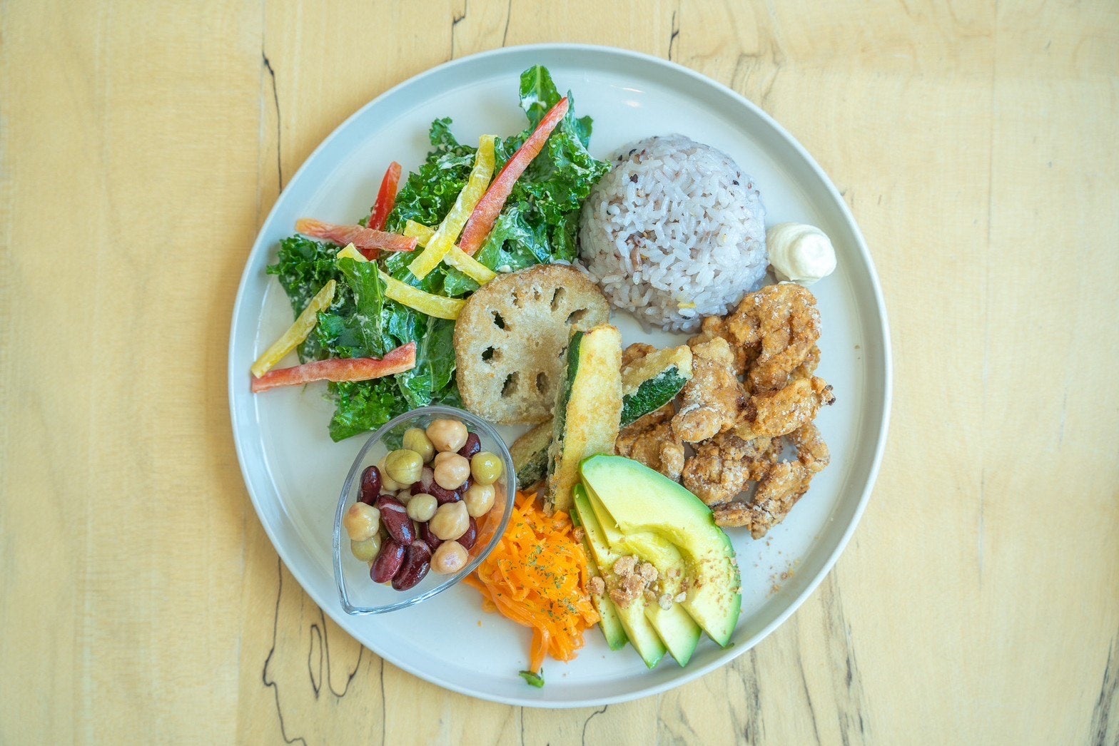 三浦で採れた、パプリカ、ケール、ニンジン、アボカド、ズッキーニを使ったフレッシュでヘルシーなブッダプレート。 自家製のヴィーガンマヨネーズは、どの食材とも相性抜群。