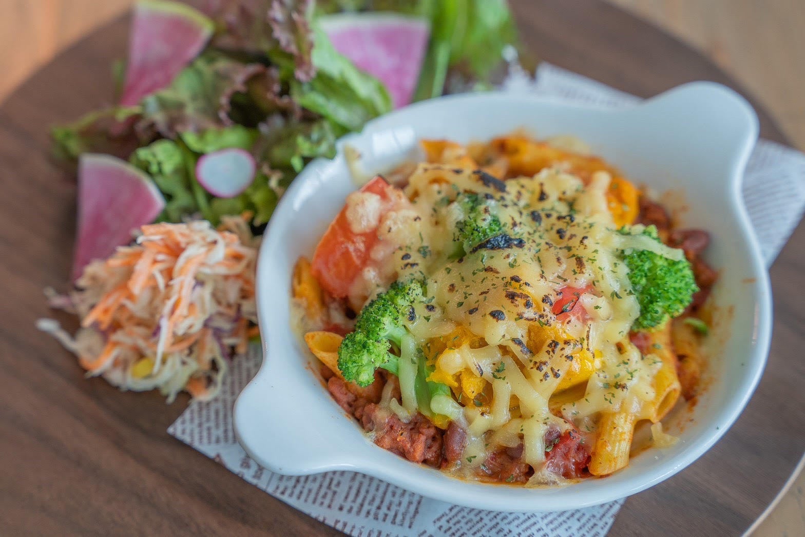 自家製チリビーンズには大豆ミートやうずら豆を使用し、クミンやコリアンダーでスパイスの香る味付けにしました。大豆由来のヴィーガンチーズに焦げ目をつけて、熱々のグラタンプレートです。