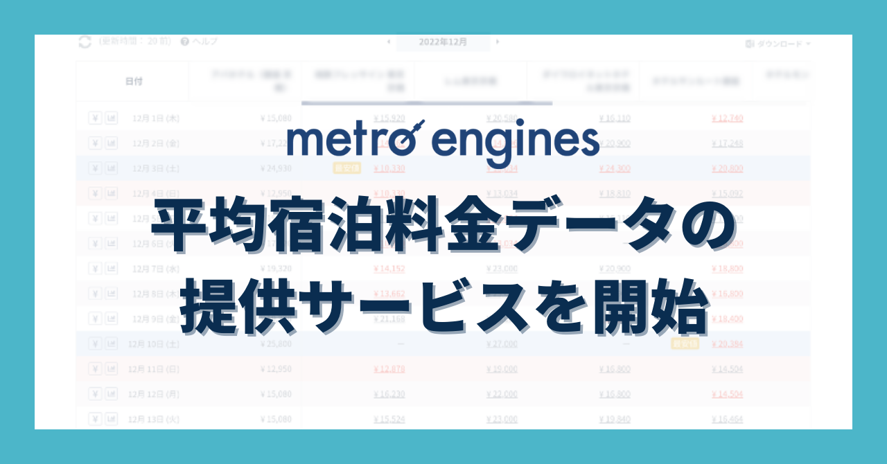 メトロエンジンでは、宿泊事業者向けDXシステム『メトロエンジン レベニューマネジメント』を提供し、宿泊事業者が需要に応じた最適な価格設定を実現できるようサービスを展開しております。その中で、本システムでの活用を目的に、宿泊に関係する様々なビッグデータを独自に収集しており、全国各地の宿泊施設における販売価格のデータも多く保有をしております。