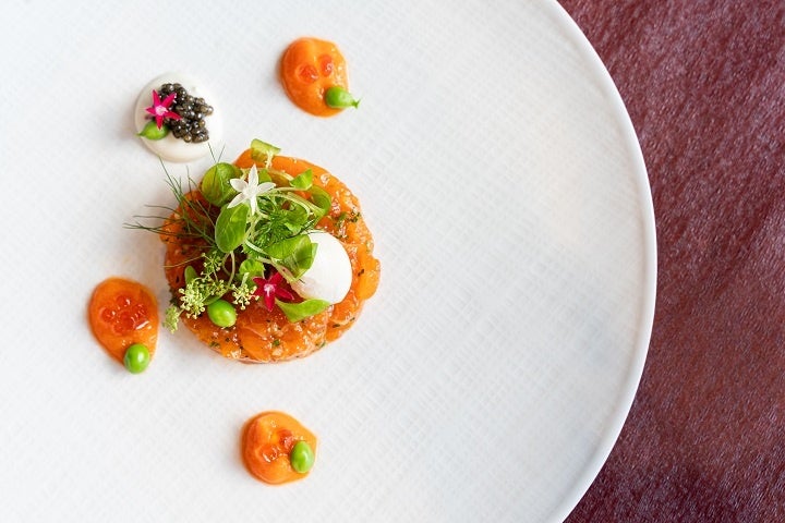 ●Dinner:富士の介サーモンのマリネ 薫香のユッケ仕立て ウズラの卵ポーチ 人参ソース マイクロハーブ キャビアクリームとイクラ