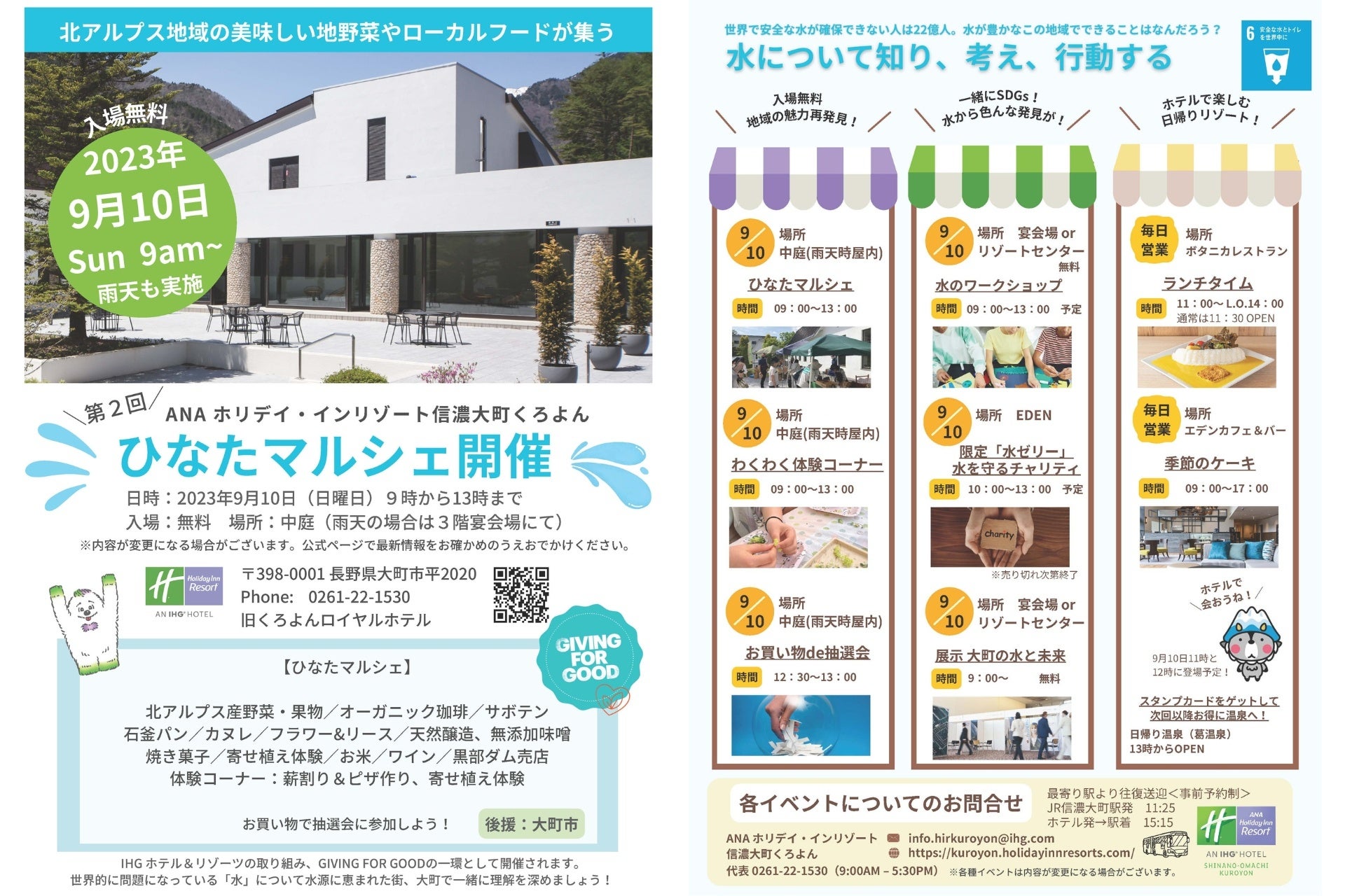 長野県北部に位置するANA ホリデイ・インリゾート信濃大町くろよんは、ホテルの地域社会と環境をサポートするIHGホテルズ&リゾーツの取り組み、Journey to Tomorrowの一環として「第2回ひなたマルシェ」を2023年9月10日(日)に開催します。
