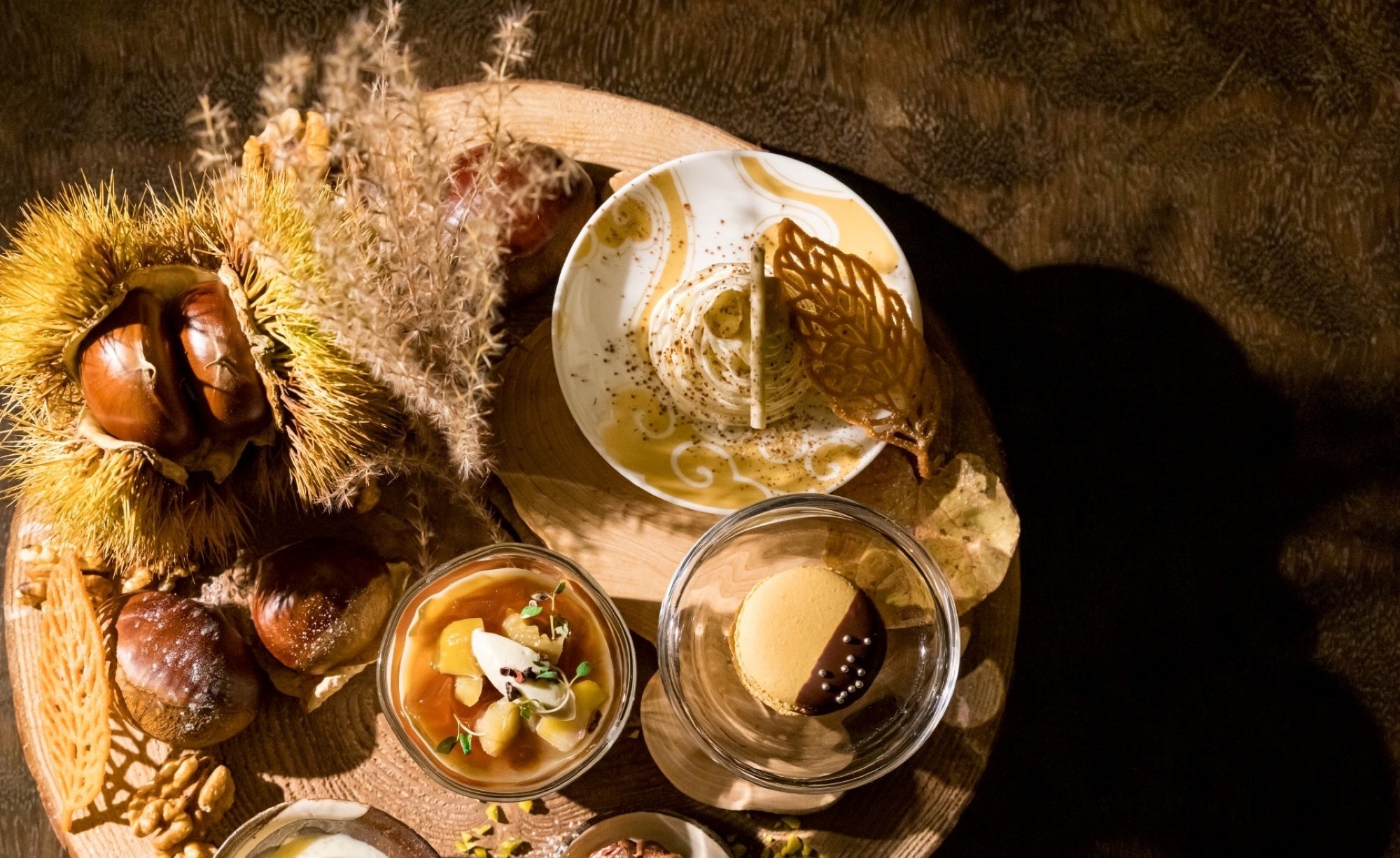 「THE HIRAMATSU 京都」のイタリア料理レストラン「リストランテ ラ・ルーチェ」のシェフパティシエ 八田 栄治(はちだ・えいじ)による今秋のウェルカムスイーツが完成し、10月限定の宿泊プランとして販売を開始しました。京都の秋の名産品として知られる丹波栗を使用した2品のほか、日本各地で旬を迎える食材を多彩なスタイルで表現し、「秋を五感で楽しんでいただきたい」という思いを形にしました。京都府京丹波町「丹波農園」が育てた「丹波栗」で作る王道のモンブランとマカロンを主役に、城陽無花果のガトー、巨峰のタルト、安納芋のブリュレの5品で構成されています。