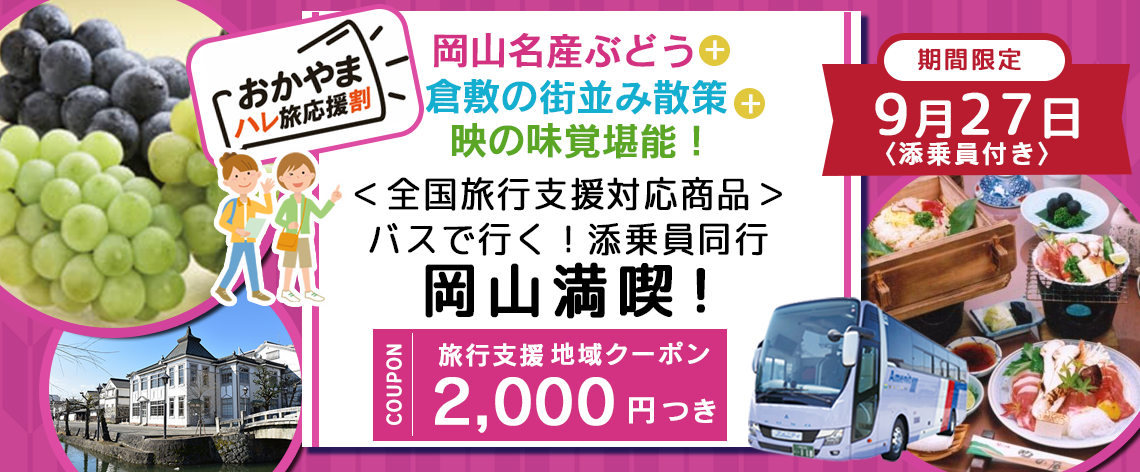 ⑥新商品 全国旅行支援対象商品 2,000円クーポン付!《ぶどうセットお土産付》9月27日(水) 【岡山県】〈大阪駅・天満橋発着・添乗員付き〉 3種類のぶどう付+倉敷の散策+昼食は松茸会席 バスで行く 『全国旅行支援を使って9月の岡山を満喫』