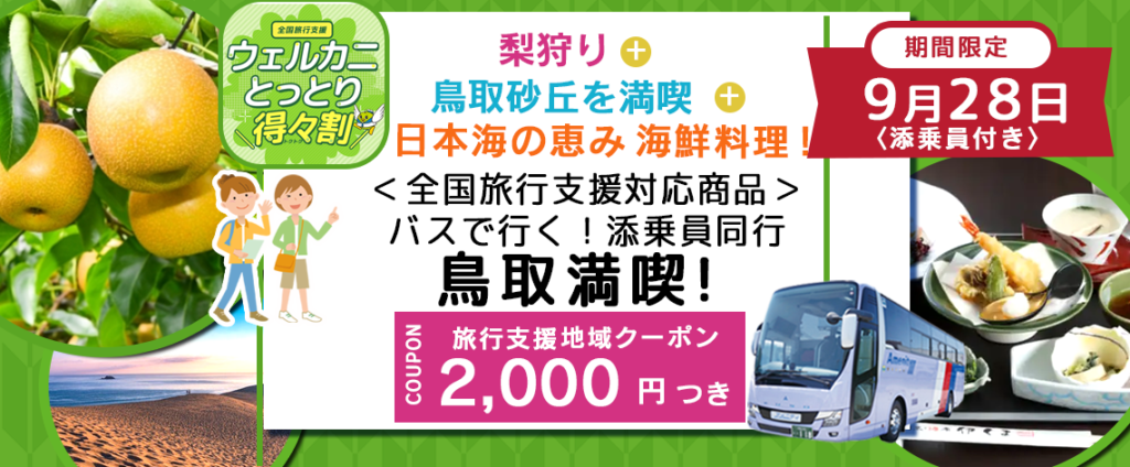 9月28日(木) 【鳥取県】〈大阪駅・天満橋発着・添乗員付き〉 鳥取砂丘の散策+梨狩り+日本海の美味しい昼食+海産物のお買い物に行こう バスで行く 『全国旅行支援を使って9月の鳥取を満喫』