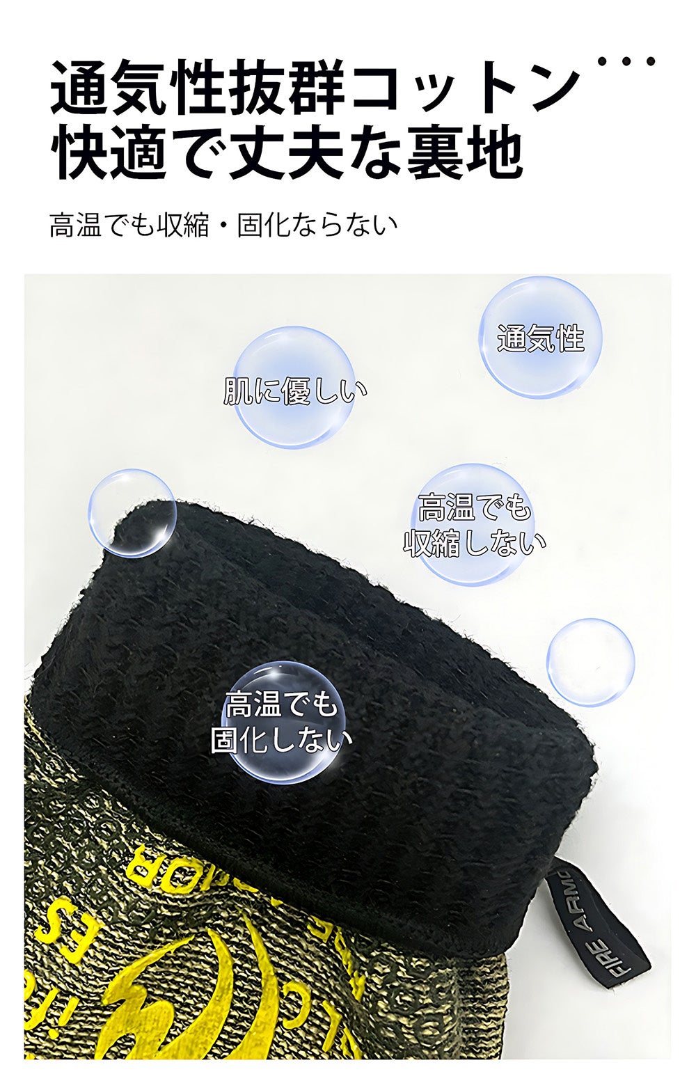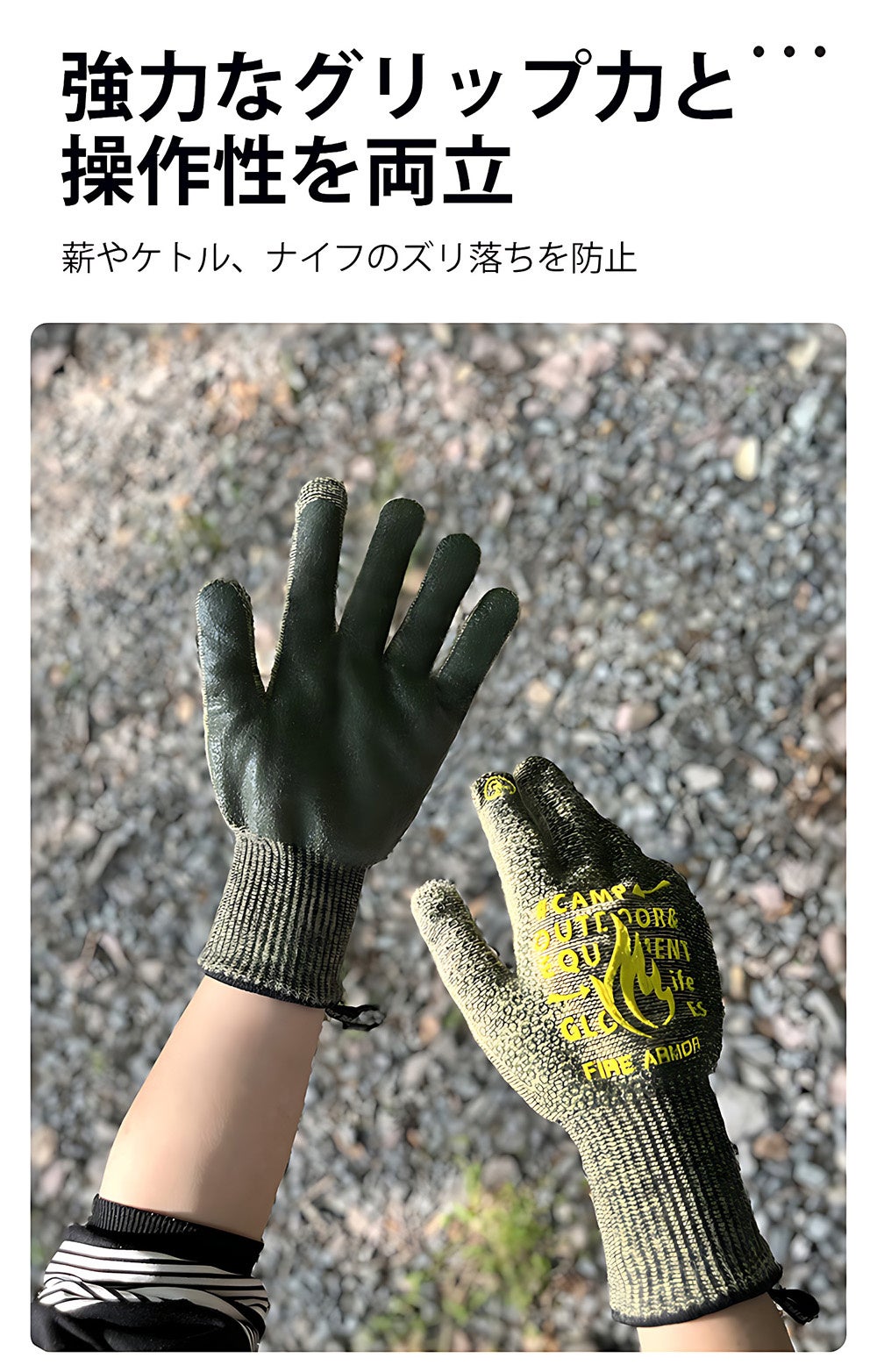 手のひらにグリップ力の強い難燃シリコン素材をコーティングしているため、滑りにくく握りやすい設計となっております。
