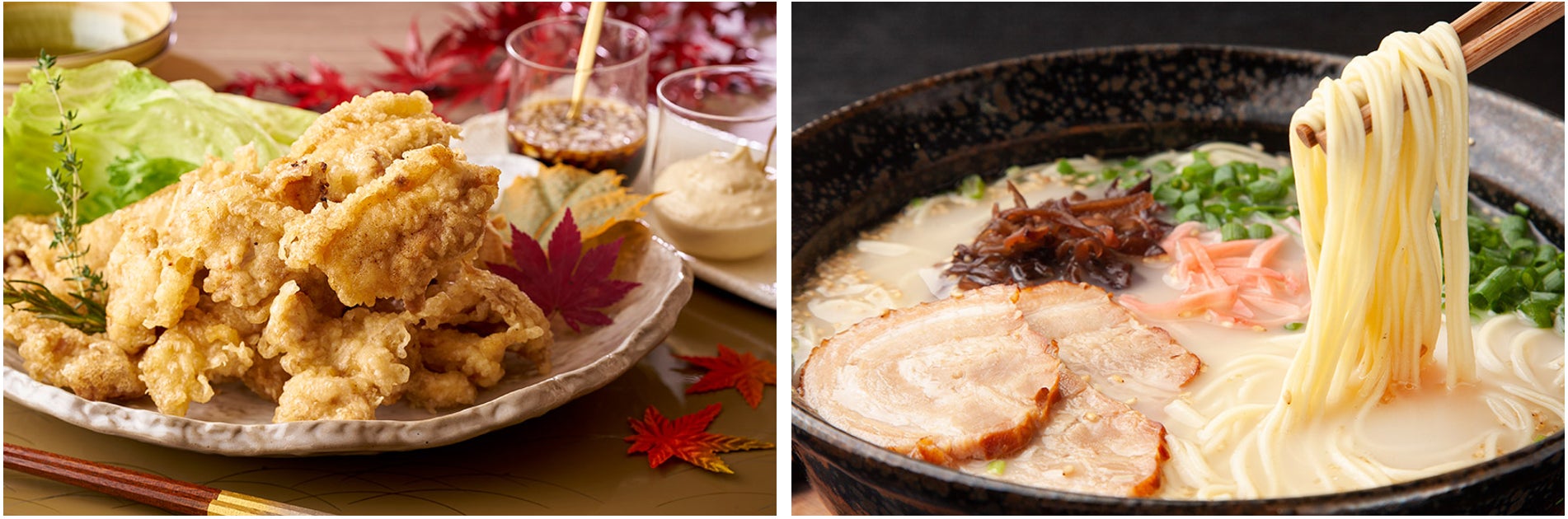 左:「大分名物 とり天」。タルタルソースを添えて、ビールもご飯も進む美味しさをお楽しみください。