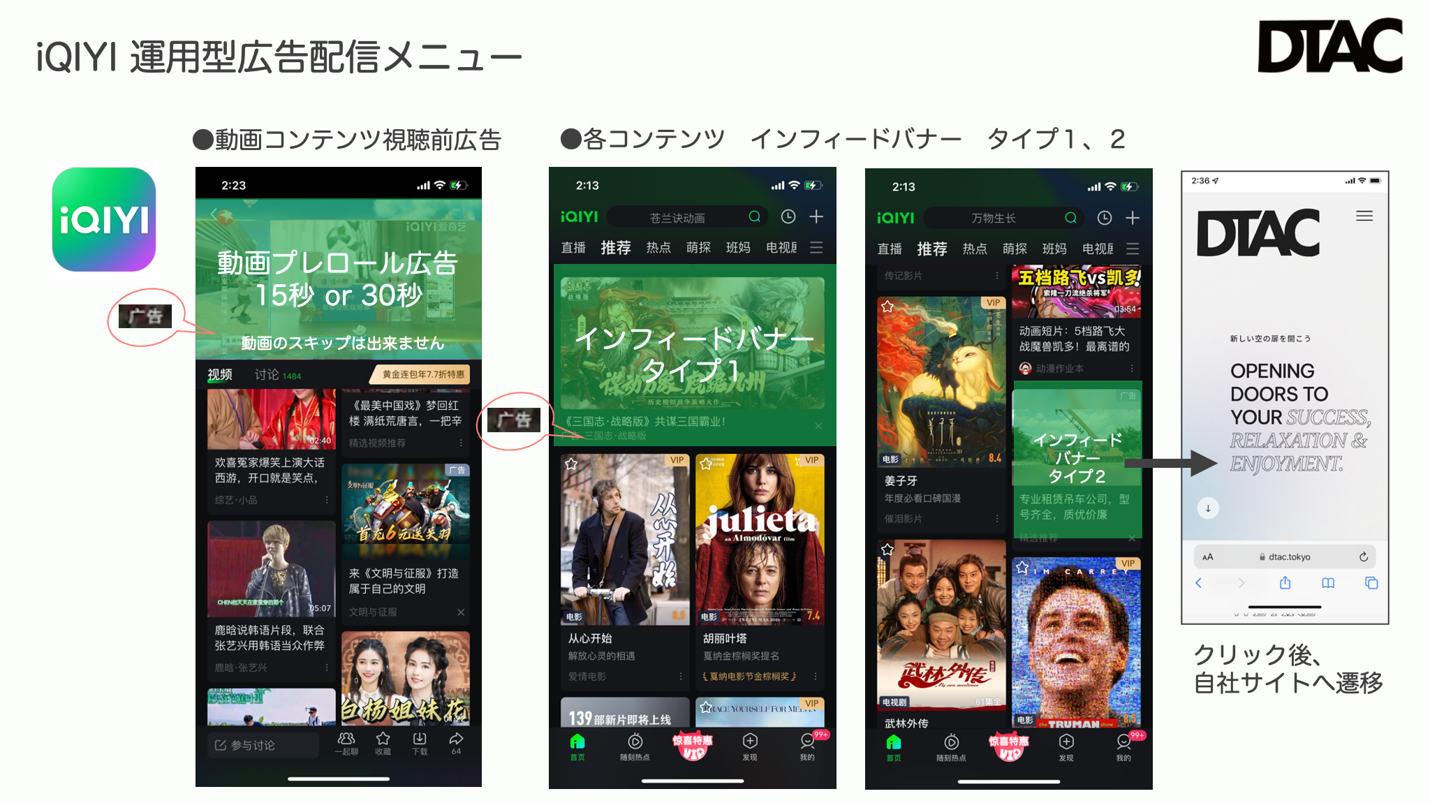 アジアを中心にデジタルマーケティングとリゾート&飲食事業で、新しい空の扉を開く株式会社DTAC(本社:東京都中央区 代表:髙橋大介 読み:ディーティエーシー)は、中国人観光客向けインバウンド施策として、中国大手動画配信アプリ iQIYI を活用した動画&Display運用型広告を新たに取り扱いをスタートしました。