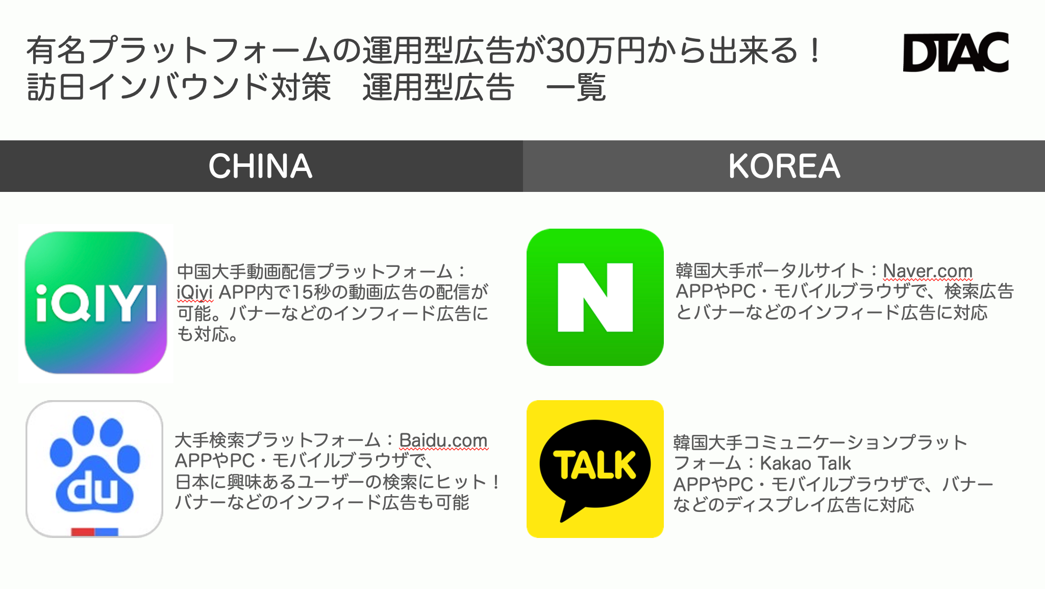 中国では、多くのインターネットのプラットフォームが乱立する状況ですが、欧米との違いは、ほとんどがバナー広告的なものが多く、人口も10倍以上多いことで、impも多いため、その分金額も大きく、これからインバウンド活用したい企業には手を出しづらいものでした。