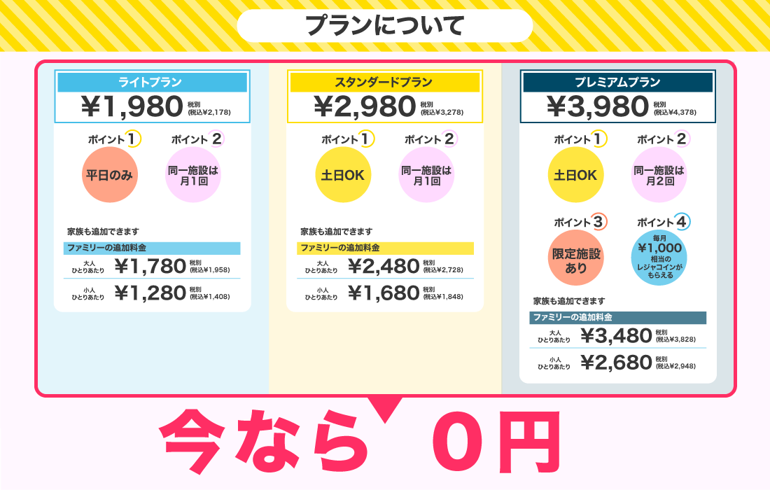 【内容】キャンペーン期間中に新規会員登録した方に限り、会員登録時にお支払いいただく初月会費と、キャンペーン期間中のファミリー追加登録費用が全て無料。