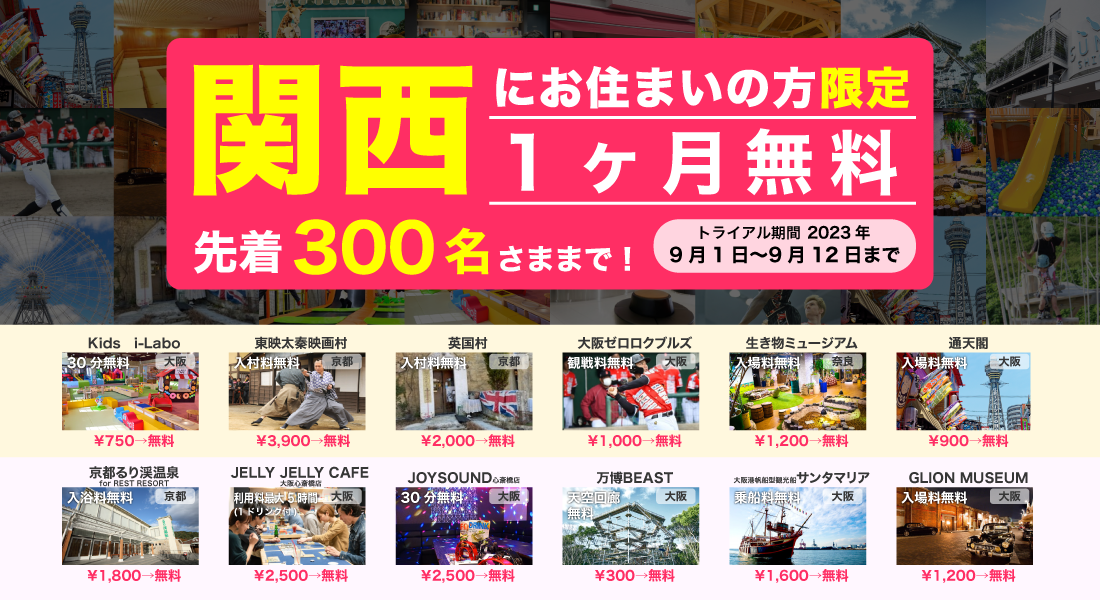 日本最大(※1)のレジャー・エンタメ定額制遊び放題サービス「レジャパス」を提供する株式会社ORIGRESS PARKS(本社:東京都品川区、代表取締役社長:吉武優)は2023年9月1日(金)~2023年9月12日(火)の期間中、関西エリア(大阪府・京都府・兵庫県・奈良県・滋賀県・和歌山県)にお住まいの方先着300名様限定でレジャパス1ヶ月無料トライアルを開催します。