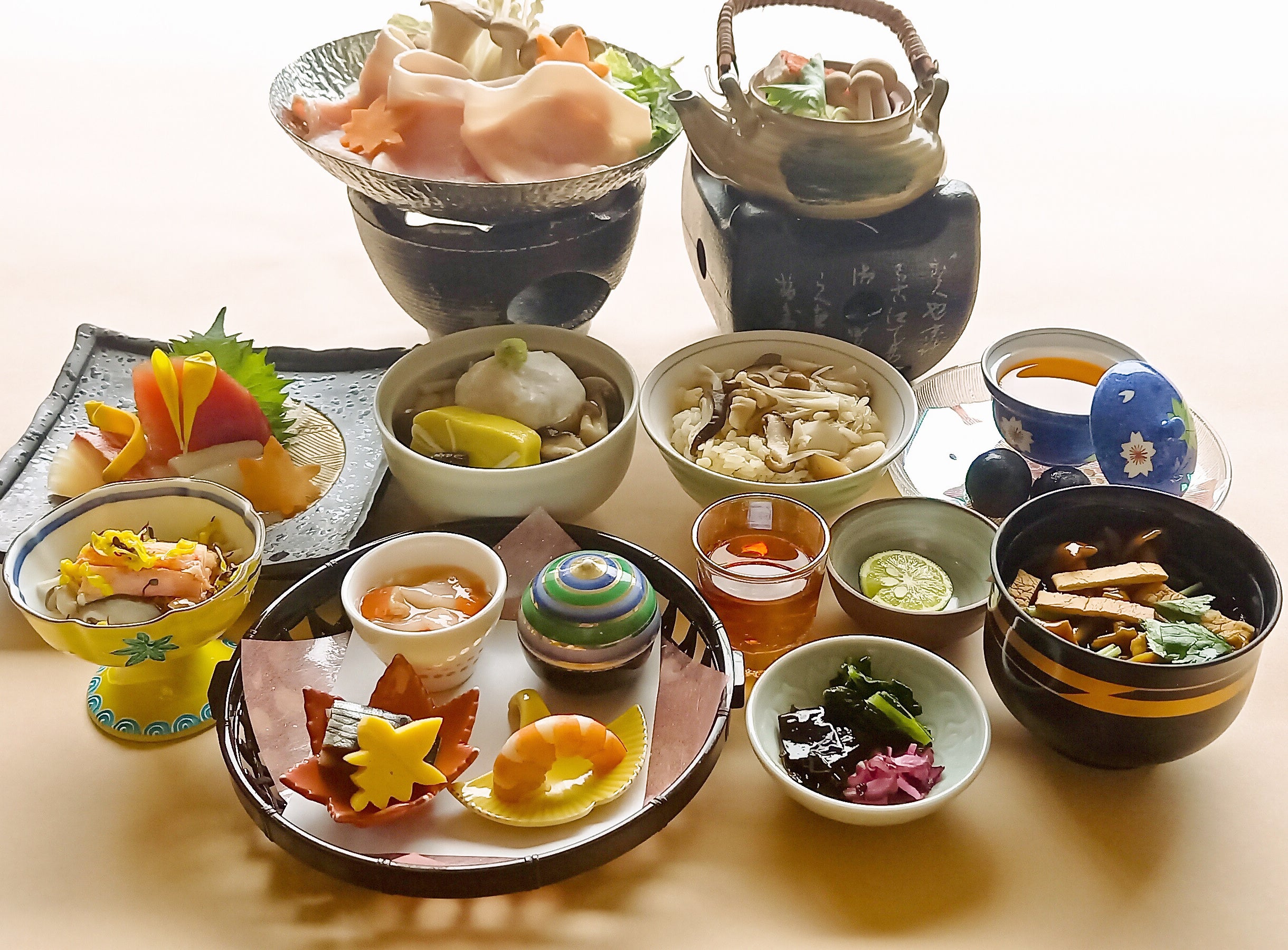 季節の恵みを盛り込んだ前菜、新鮮なお刺身に熱々で召し上がる金目鯛と大黒しめじの土瓶蒸し。秋の小鍋はとこ豚とたっぷりきのこの鍋で熱々でお楽しみ頂きます。温物は上品な蓮根饅頭のきのこ餡、蟹と菊花の酢の物、食事から水菓子まで季節の味わい「花紅葉会席」をお召し上がりください。
