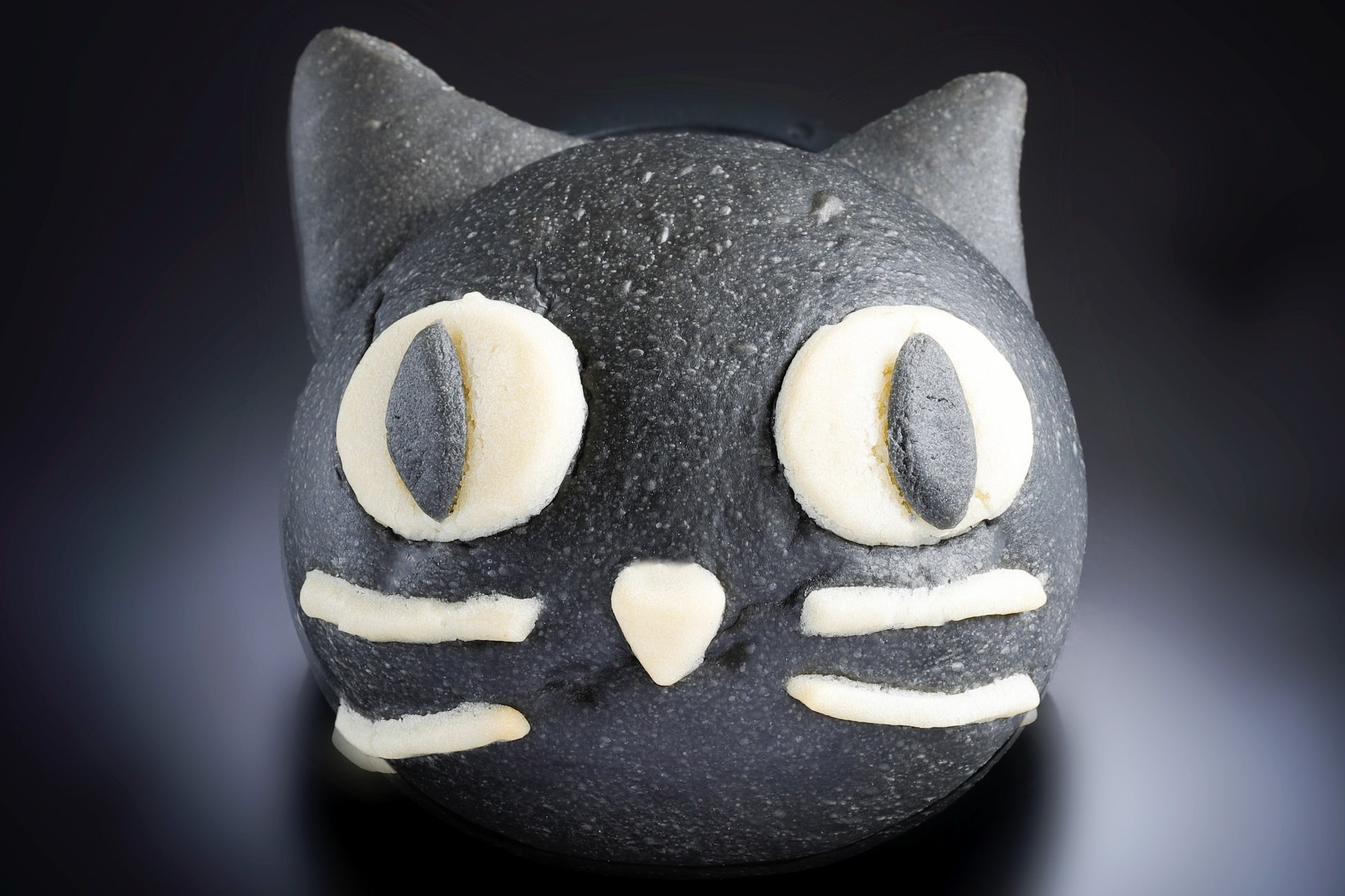 炭パウダーを練り込んだ生地を使用し、クッキー生地で作った目やひげを付け、黒ねこをイメージしました。中にはチョコカスタードクリームが入っています。