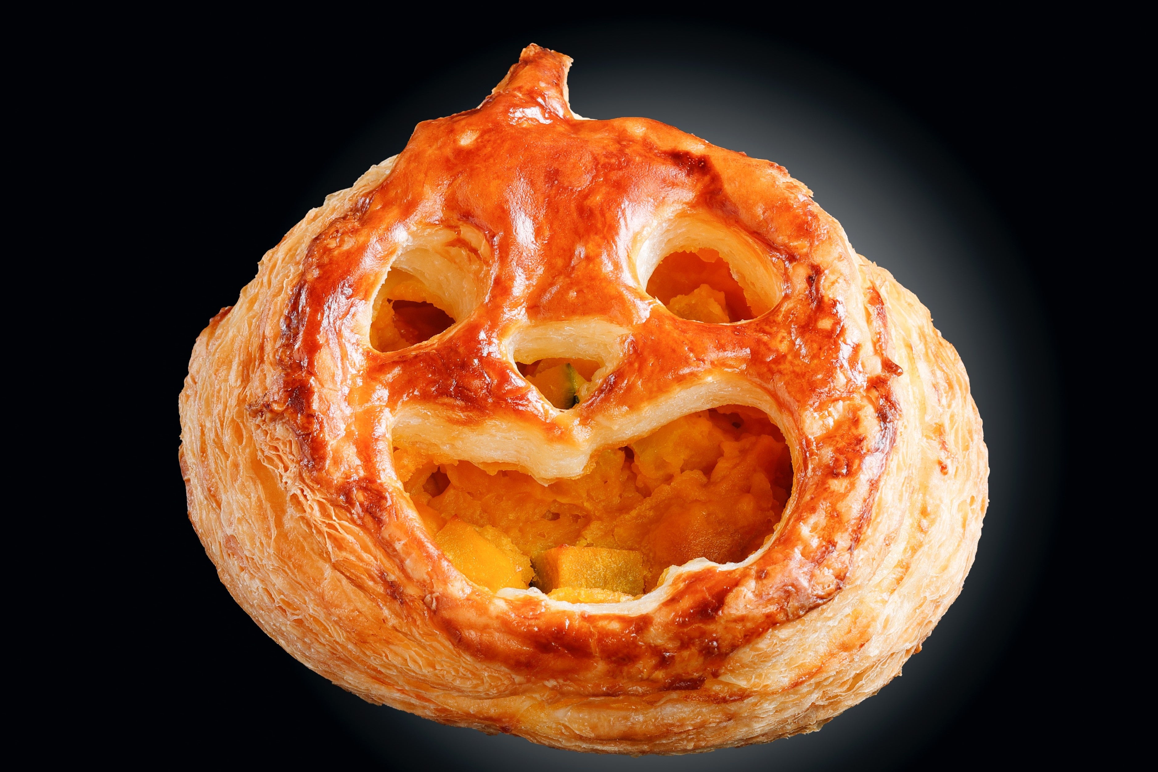 ダイス状にカットしたかぼちゃとかぼちゃクリームをデニッシュ生地で包み、焼き上げました。サクサクした食感とバターの芳醇な香り、かぼちゃのやさしい味を楽しめる、ジャック・オー・ランタンを模ったパンプキンパイです。
