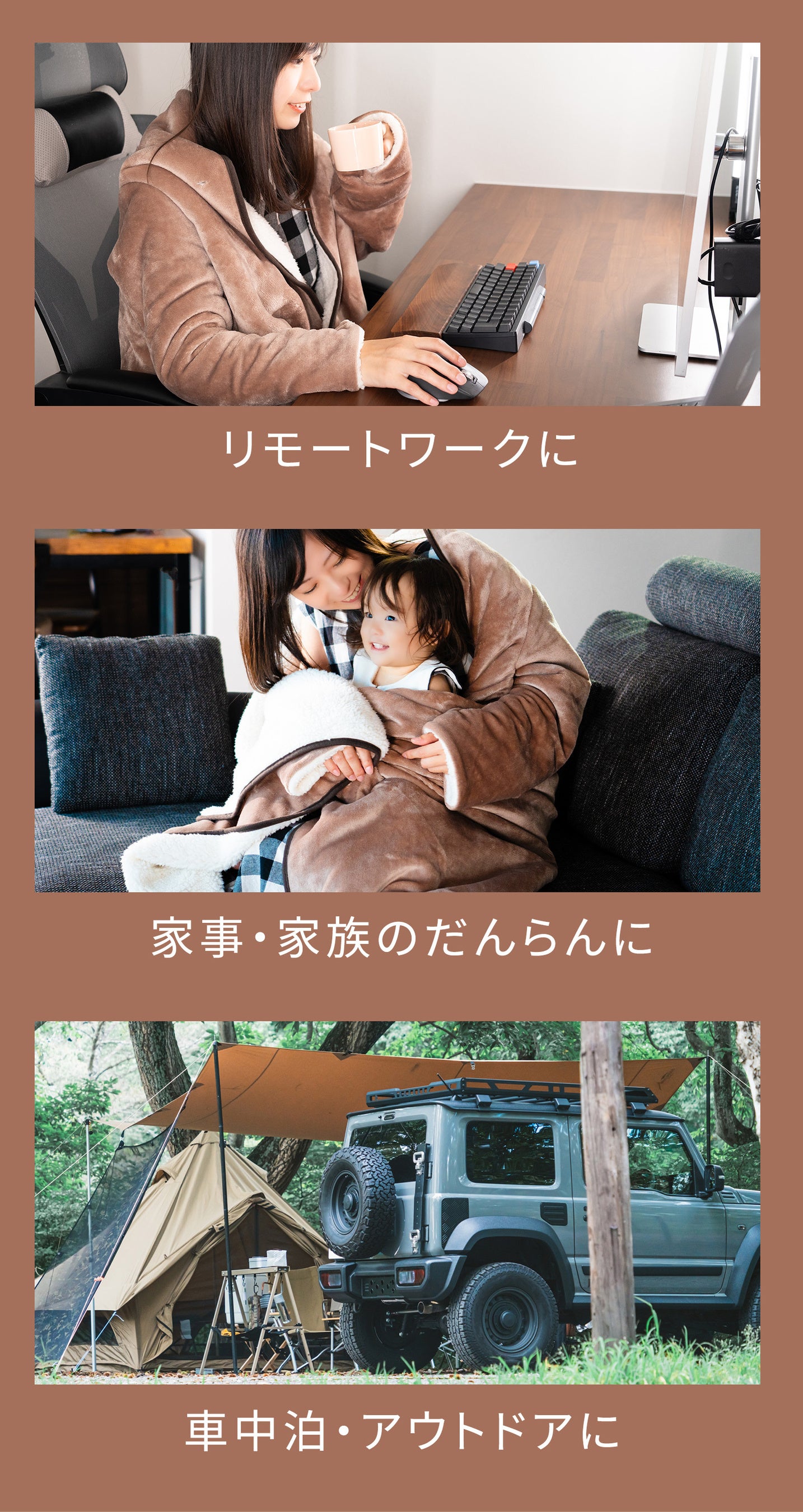 ヒーター搭載の145cm×160cmの⼤判サイズブランケットなので、着ても被っても⼗分な⼤きさです。