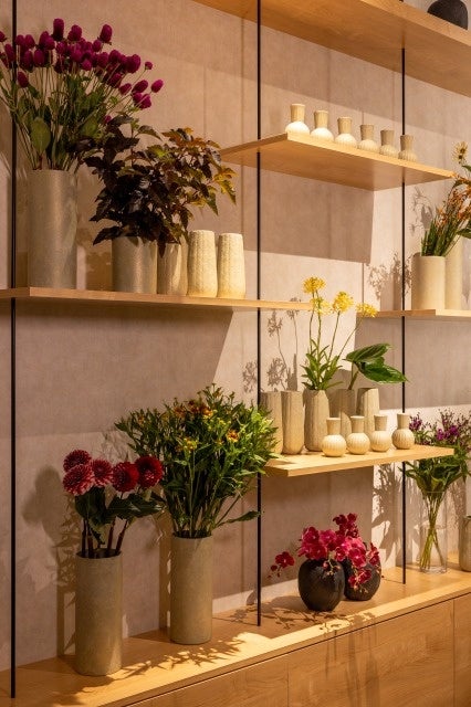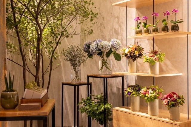 木材を使用したナチュラルな雰囲気の店内の一部壁面には、塗料の特性を活かしてペイントし、同じ物はふたつとない色味や質感でひとつのアート作品のように仕上がる「テクスチャーペイント」と呼ばれるヨーロッパで古くから伝わる技法を採用。この「テクスチャーペイント」と同じ手法を用い、国内の職人がひとつひとつ手作業で塗装を施したオリジナルの花器も取り扱います。また、フラワーアレンジメントに加え、日々の生活に彩りを添える生花を1輪よりそろえ、日常使いから特別なギフトに最適なアイテムまで、ゲスト皆さまのさまざまなライフスタイルにお応えするラインナップをご用意いたします。