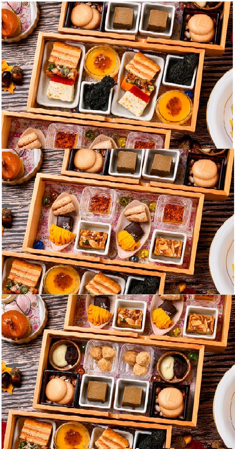 セイボリーでは、「冷製カボチャスープとコンソメジュレ」「フレンチトースト・スモークサーモンミルフィーユ」「ナスの海老詰め揚げ 竹炭パン粉」「キノコオムレツのミニバーガー」が新登場。定番人気の当店のスペシャリティ「トリュフ風味のポテトエスプーマ 」や「ミニオムライス」、昔ながらの味わい「自家製カスタードプリン」もお楽しみいただけます。