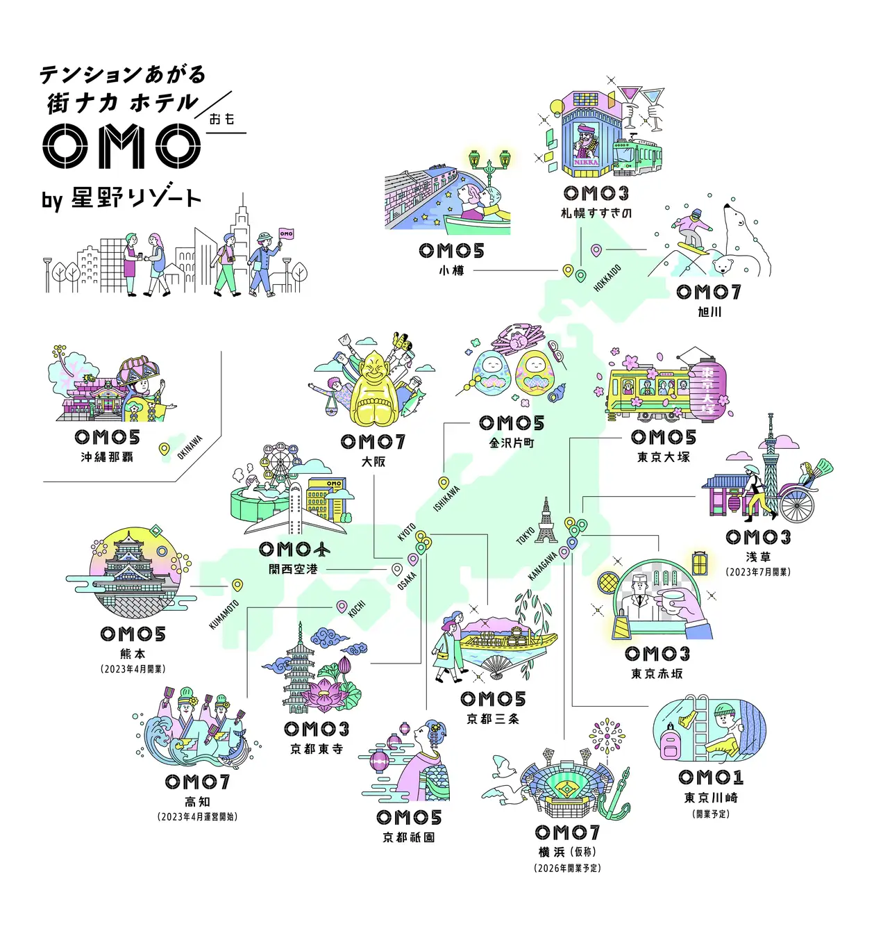 「OMO」は星野リゾートが全国に展開する「テンションあがる『街ナカ』ホテル」。街をこよなく愛するスタッフが地域の方々と仕掛ける、新感覚のホテル。思いもよらない魅力に出会い、知らず知らずのうちにその街までお気に入りに。2023年7月31日にはOMO3浅草が誕生し、現在15施設展開中。