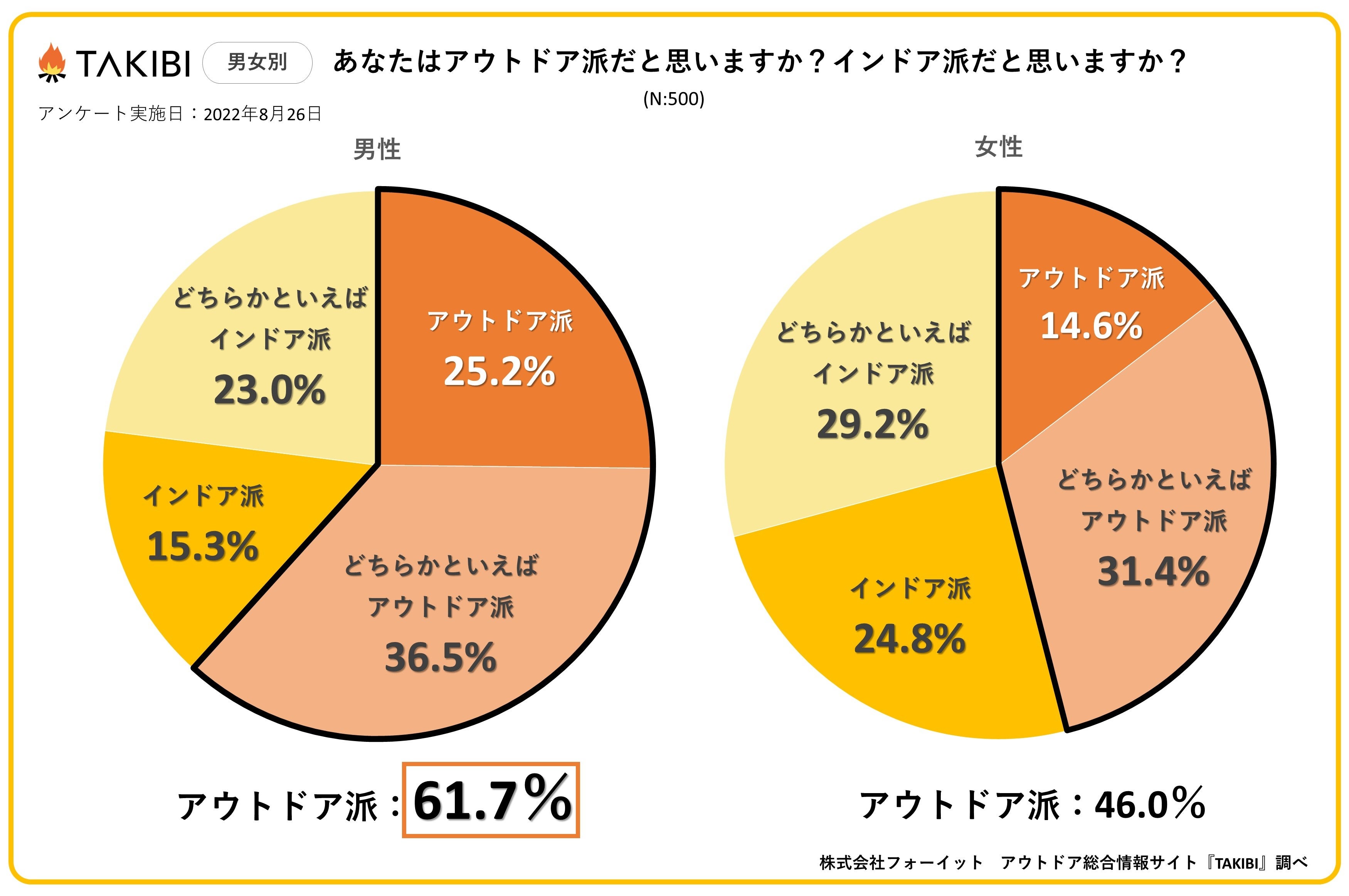 以前実施した、「あなたはアウトドア派だと思いますか?インドア派だと思いますか?」というアンケートでは、「アウトドア派」だと回答した方は男性で61.7%、女性で46.0%と、男性が15.7%上回る結果となりました。