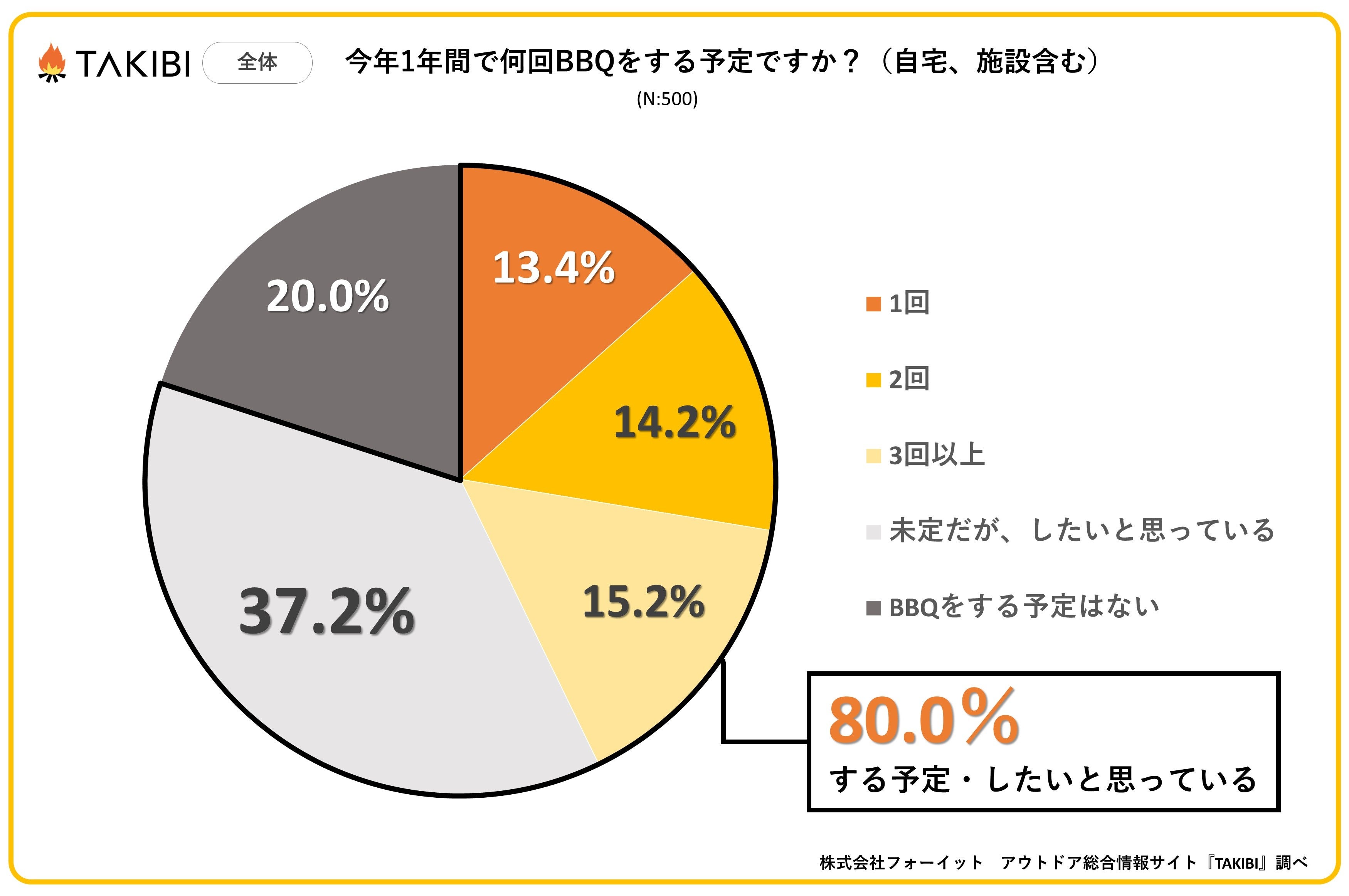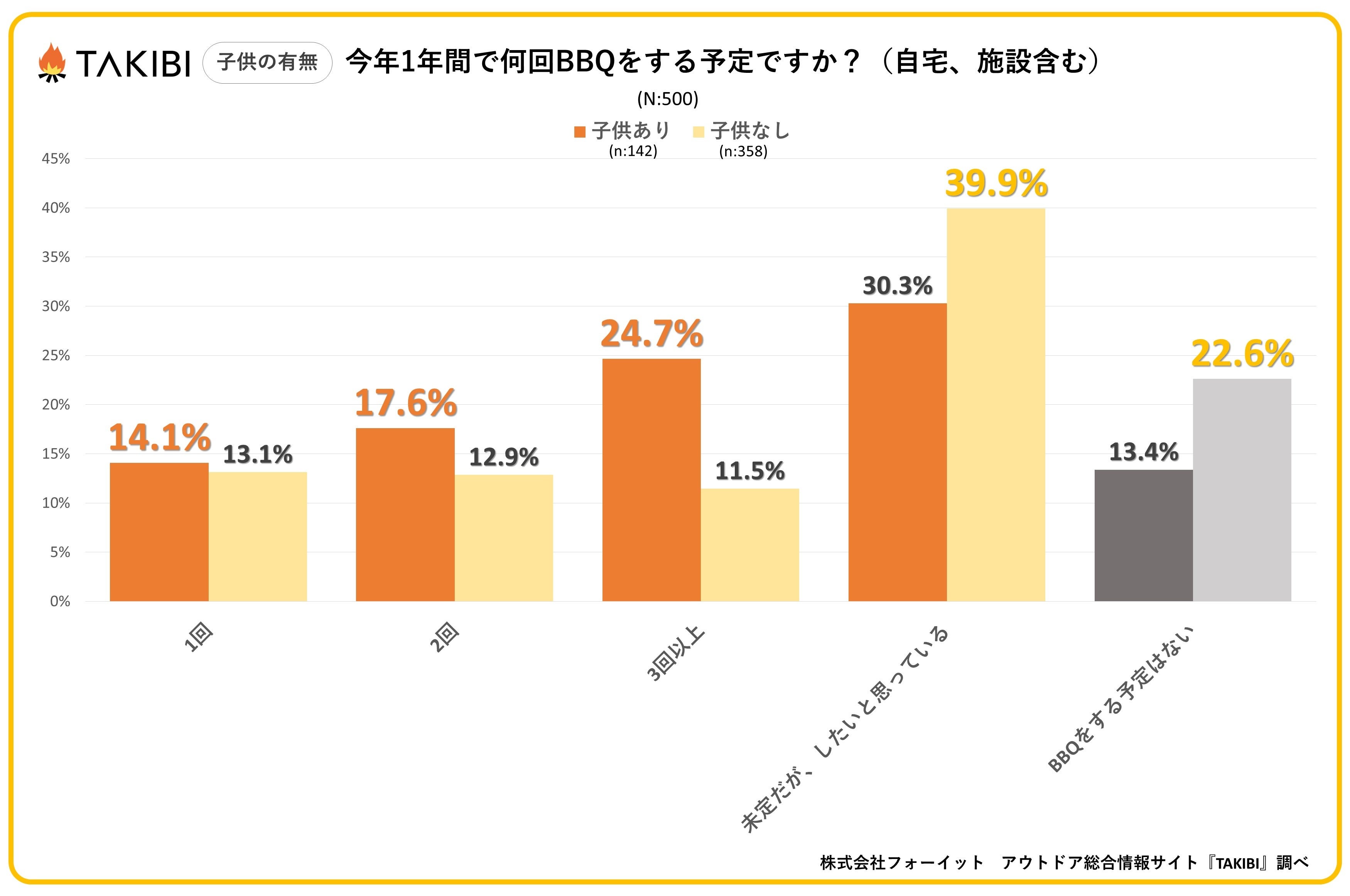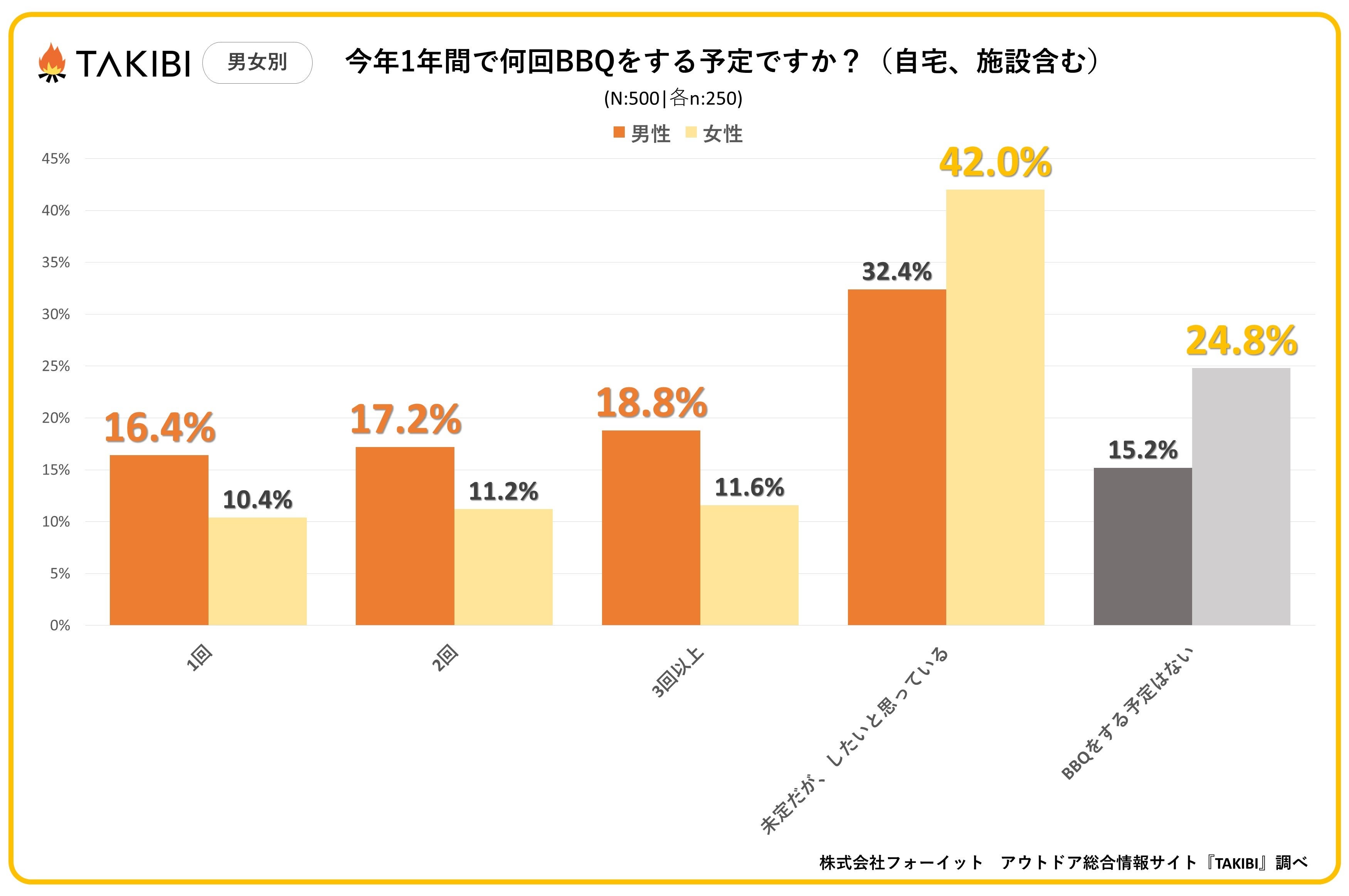 キャンプやグランピングを中心としたアウトドア総合情報サイト「TAKIBI」の運営をおこなう株式会社フォーイットは、全国の10代~50代までの男女500人を対象にバーベキューに関するアンケートを実施し、男女別・年代別等の特徴についてまとめました。