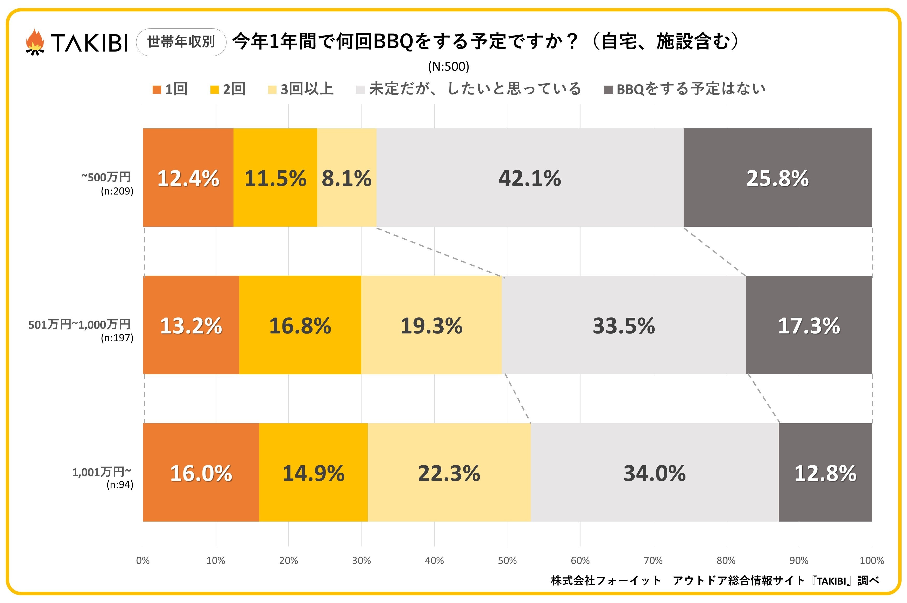 世帯年収別に見ると、「世帯年収500万円」を境に、BBQの具体的な計画を立てている方が大幅に増加する結果となりました。特に、「世帯年収1,001万円~」では「3回以上」の回答率が最も高く、22.3%となりました。
